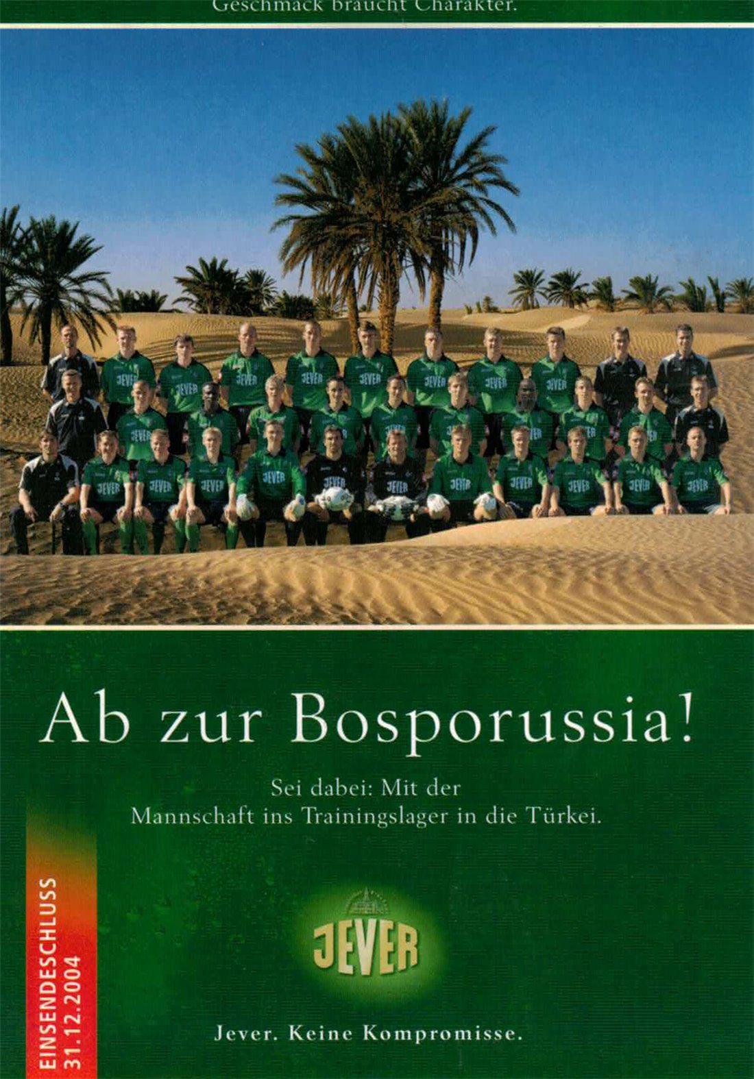 Geschmack braucht Charakter. / Ab zur Bosporussia! / Sei dabei: Mit der Mannschaft ins Trainigslager in der Türkei. / EINSENDESCHLUSS 31.12.2004 / Friesisches Brauhaus / JEVER / Jever. Keine Kompromisse.