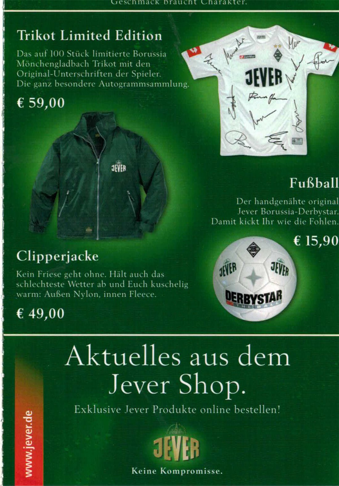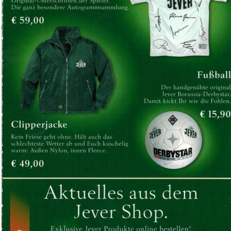 Geschmack braucht Charakter. / Trikot Limited Edition / Das auf 100 Stück limitierte Borussia Mönchengladbach Trikot mit den Original-Unterschriften der Spieler. Die ganz besondere Autogrammsammlung. / € 59,00 / Fußball / Der handgenähte original Jever Borussia-Derbystar. Damit kickt Ihr wie die Fohlen. € 15,90 / Clipperjacke / Kein Friese geht ohne. Hält auch das schlechteste Wetter ab und Euch kuschelig warm: Außen Nylon, innen Fleece. / € 49,00 / Aktuelles aus dem Jever Shop. / Exklusive Jever Produkte online bestellen! / www.jever.de / Friesisches Brauhaus / JEVER / Keine Kompromisse.