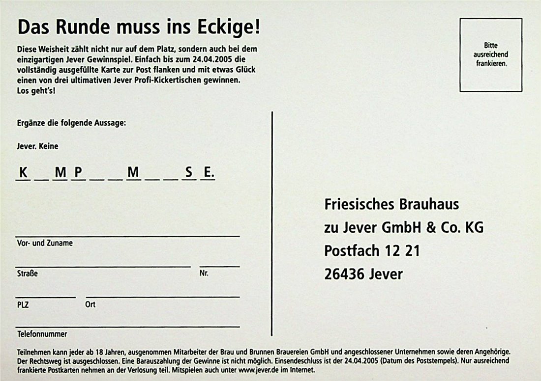 Das Runde muss ins Eckige! / Diese Weisheit zählt nicht nur auf dem Platz, sondern auch bei dem einzigartigen Jever Gewinnspiel. Einfach bis zum 24.04.2005 die vollständig ausgefüllte Karte zur Post flanken und mit etwas Glück einen von drei ultimativen Jever Profi-Kickertischen gewinnen. Los geht’s! / Ergänze die folgende Aussage: Jever. Keine K_MPMSE. / Vor- und Zuname / Straße / Nr. / PLZ / Ort / Mitmachen darf jeder über 18 Jahre, ausgenommen Mitarbeiter der Brau und Brunnen Brauereien GmbH und angeschlossener Unternehmen sowie deren Angehörige. Der Rechtsweg ist ausgeschlossen. Eine Barauszahlung der Gewinne ist nicht möglich. Einsendeschluss ist der 24.04.2005 (Datum des Poststempels). Nur ausreichend frankierte Postkarten nehmen an der Verlosung teil. Mitspielen auch unter www.jever.de im Internet. / Bitte ausreichend frankieren. / Friesisches Brauhaus zu Jever GmbH & Co. KG Postfach 1221 26436 Jever