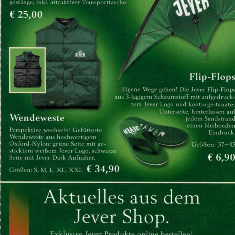 Geschmack braucht Charakter. / Lenkdrachen Standfest bleiben - auch bei Windstärke 5. Mit dem friesischen Himmelsstürmer (165 cm x 80 cm) aus strapazierfähigem Nylon und stabilem Glasfibergestänge, inkl. attraktiver Transporttasche. / € 25,00 / Flip-Flops Eigene Wege gehen! Die Jever Flip-Flops aus 3-lagigem Schaumstoff mit aufgedrucktem Jever Logo und konturgestanzter Unterseite, hinterlassen auf jedem Sandstrand einen bleibenden Eindruck! Größen: 37-45 / € 6,90 / Wendeweste Perspektive wechseln! Gefütterte Wendeweset aus hochwertigem Oxford-Nylon: grüne Seite mit gesticktem weißem Jever Logo, schwarze Seite mit Jevere Dark Aufnäher. Größen: S, M, L, XL, XXL / € 34,90 / Aktuelles aus dem Jever Shop. / Exklusive Jever Produkte online bestellen! / www.jever.de / Friesisches Brauhaus / JEVER / Keine Kompromisse.
