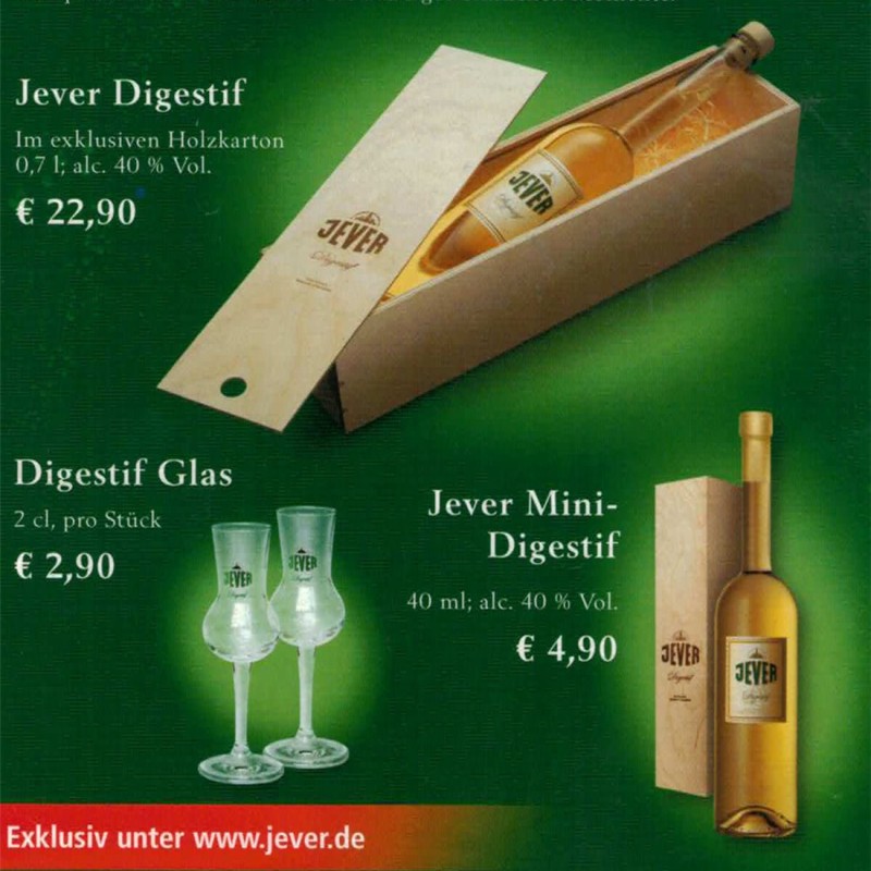 Jever Digestif. / Jever Digestif - eine Spirituosenspezialität von höchster Qualität, gebraut nach alter Tradition und destilliert aus den erlesenen Zutaten frischen Jever Pilseners. Kompromissloser Genuss für die außergewöhnlichen Momente. / Jever Digestif Im exklusiven Holzkarton 0,7l; alc. 40% Vol. / € 22,90 / Digestif Glas 2-4 cl, pro Stück / € 2,90 / Jever Mini-Digestif 40ml; alc. 40% Vol. / € 4,90 / Exklusiv unter www.jever.de / Diese Produkte stellen natürlich nur eine kleine Auswahl aus dem stets aktuellen Sortiment des Jever Shops dar. Weitere trendige Accessoires, Modeartikel und vieles mehr für Jever Fans und solche, die es werden wollen, findet Ihr unter www.jever.de im Jever Shop!