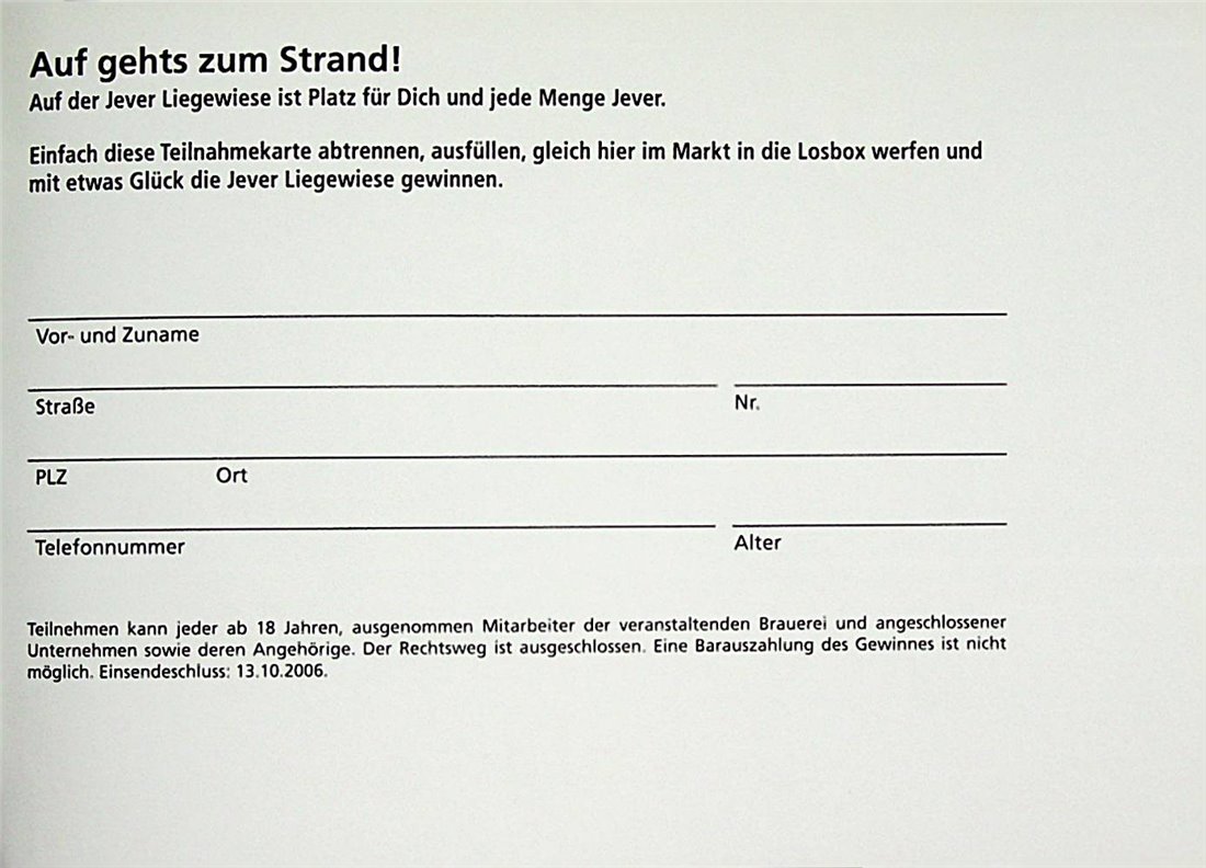 Auf gehts zum Strand! / Auf der Jever Liegewiese ist Platz für Dich und jede Menge Jever. / Einfach diese Teilnahmekarte abtrennen, ausfüllen, gleich hier im Markt in die Losbox werfen und mit etwas Glück die Jever Liegewiese gewinnen. / Vor- und Zuname / Straße / Nr. / PLZ / Ort / Telefonnummer / Alter / Teilnehmen kann jeder ab 18 Jahren, ausgenommen Mitarbeiter der veranstaltenden Brauerei und angeschlossener Unternehmen sowie deren Angehörige. Der Rechtsweg ist ausgeschlossen. Eine Barauszahlung des Gewinnes ist nicht möglich. Einsendeschluss: 13.10.2006.