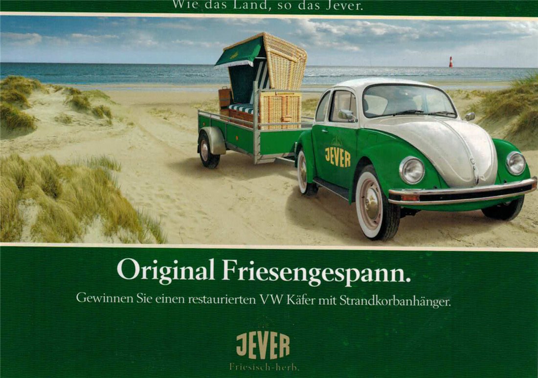 Wie das Land, so das Jever. / Original Friesengespann. / Gewinnen Sie einen restaurierten VW Käfer mit Strandkorbanhänger. / Friesisches Brauhaus / JEVER / Friesisch-herb.