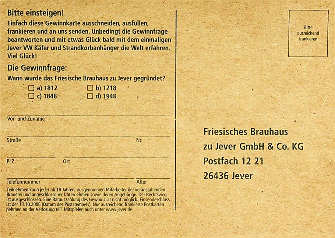 Bitte einsteigen! / Einfach diese Gewinnkarte ausschneiden, ausfüllen, frankieren und an uns senden. / Unbedingt die Gewinnfrage beantworten und mit etwas Glück bald mit dem einmaligen Jever VW Käfer und Strandkorbanhänger die Welt erfahren. Viel Glück! / Die Gewinnfrage: Wann wurde das Friesische Brauhaus zu Jever gegründet? / a) 1812 / b) 1218 / c) 1848 / d) 1948 / Vor- und Zuname / Straße / Nr. / PLZ / Ort / Telefonnummer / Alter / Teilnehmen kann jeder ab 18 Jahren, ausgenommen Mitarbeiter der veranstaltenden Brauerei und angeschlossener Unternehmen sowie deren Angehörige. Der Rechtsweg ist ausgeschlossen. Eine Barauszahlung des Gewinns ist nicht möglich. Einsendeschluss ist der 13.10.2006 (Datum des Poststempels). Nur ausreichend frankierte Postkarten nehmen an der Verlosung teil. Mitspielen auch unter www.jever.de / Bitte ausreichend frankieren. / Friesisches Brauhaus zu Jever GmbH & Co. KG Postfach 1221 26436 Jever