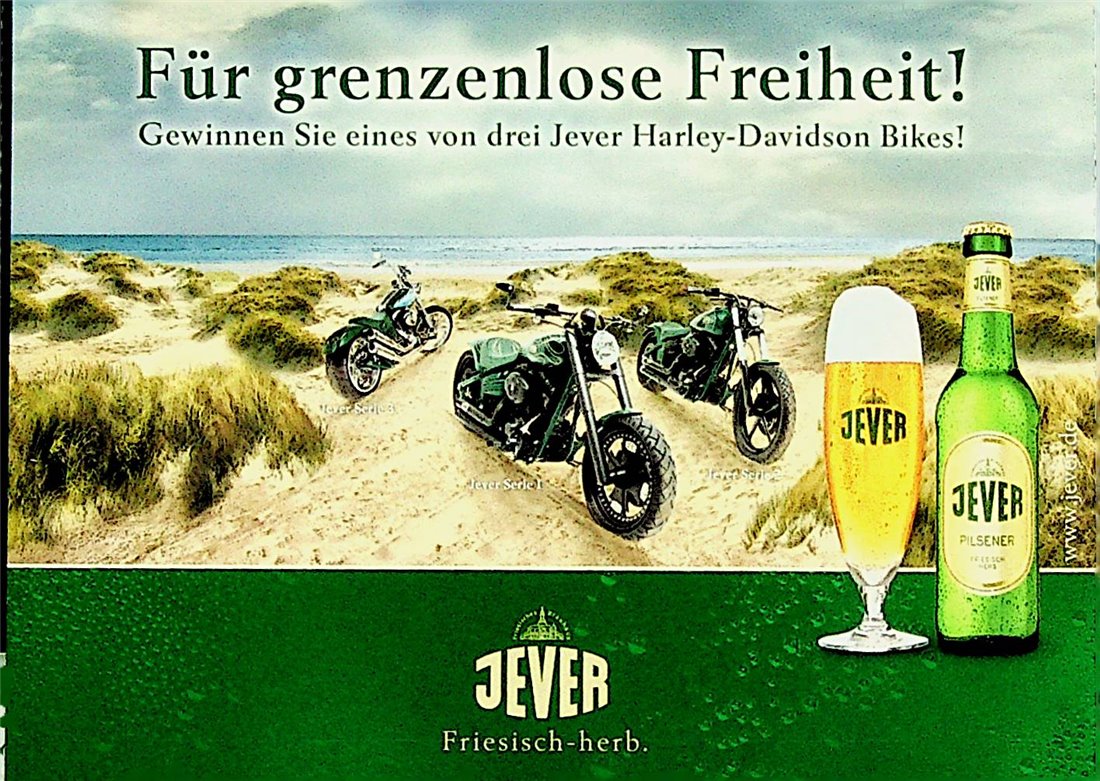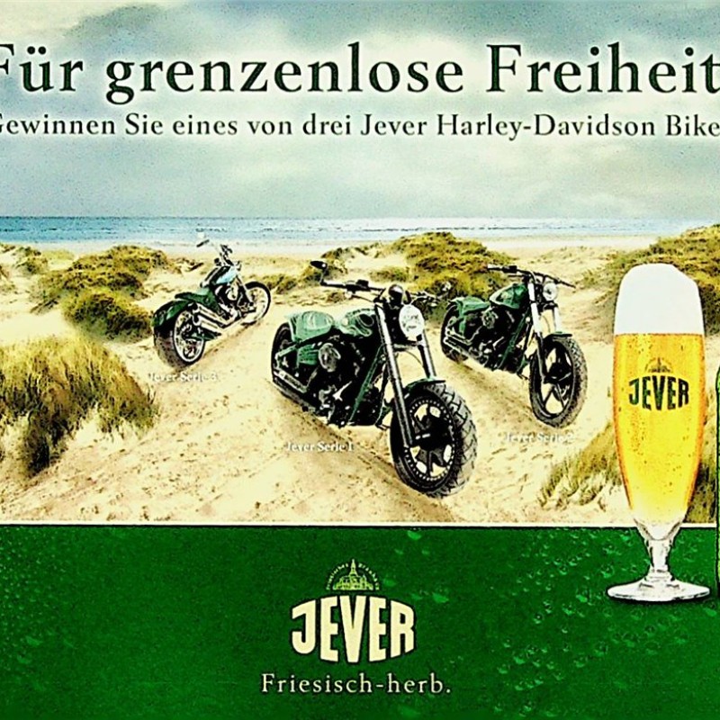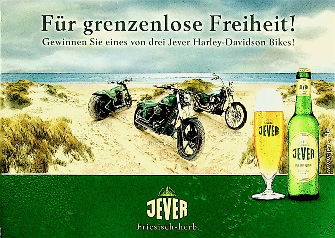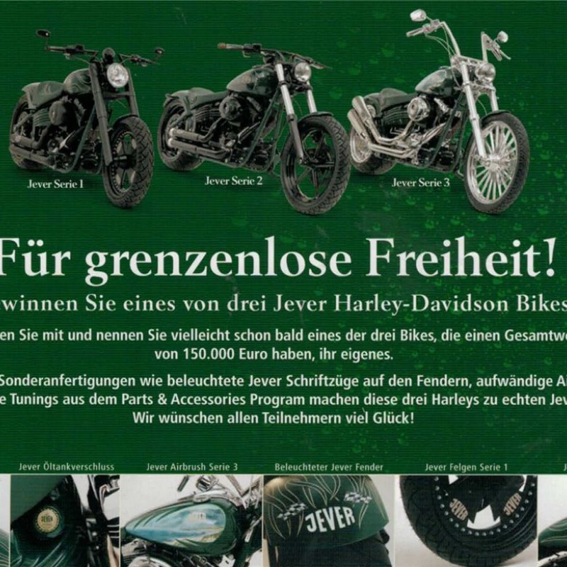 Jever Serie 1 / Jever Serie 2 / Jever Serie 3 / Für grenzenlose Freiheit! / Gewinnen Sie eines von drei Jever Harley-Davidson Bikes! / Machen Sie mit und nennen Sie vielleicht schon bald eines der drei Bikes, die einen gesamtwert von 150.000 Euro haben, ihr eigenes. / Unzählige Sonderanfertigungen wie beleuchtete Jever Schriftzüge auf den Fendern, aufwändige Airbrushs und technische Tunings aus dem Parts & Accessories Program machen diese drei Harleys zu echten Jever Harleys. Wir wünschen allen Teilnehmern viel Glück! / Jever Werkzeugkasten / Jever Öltankverschluss / Jever Airbrush Serie 3 / Beleuchteter Jever Fender / Jever Felgen Serie 1 / Jever Airbrush Serie 1