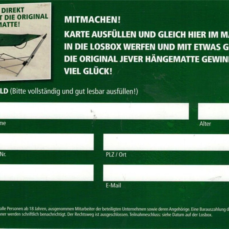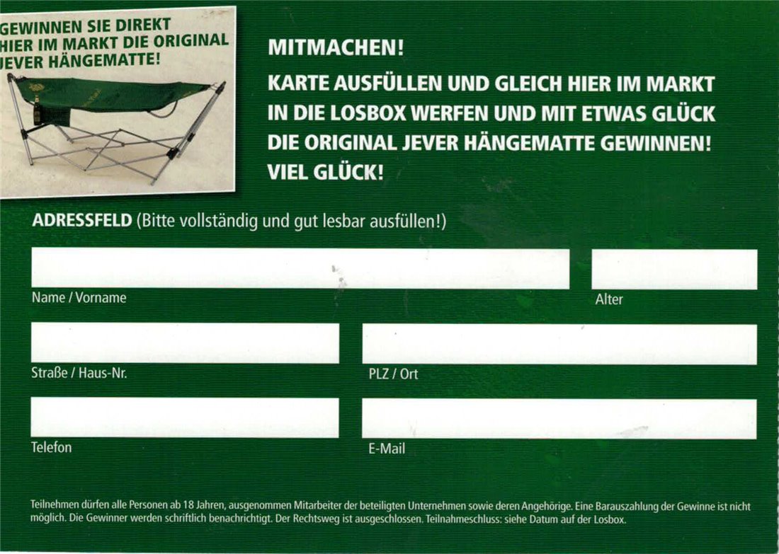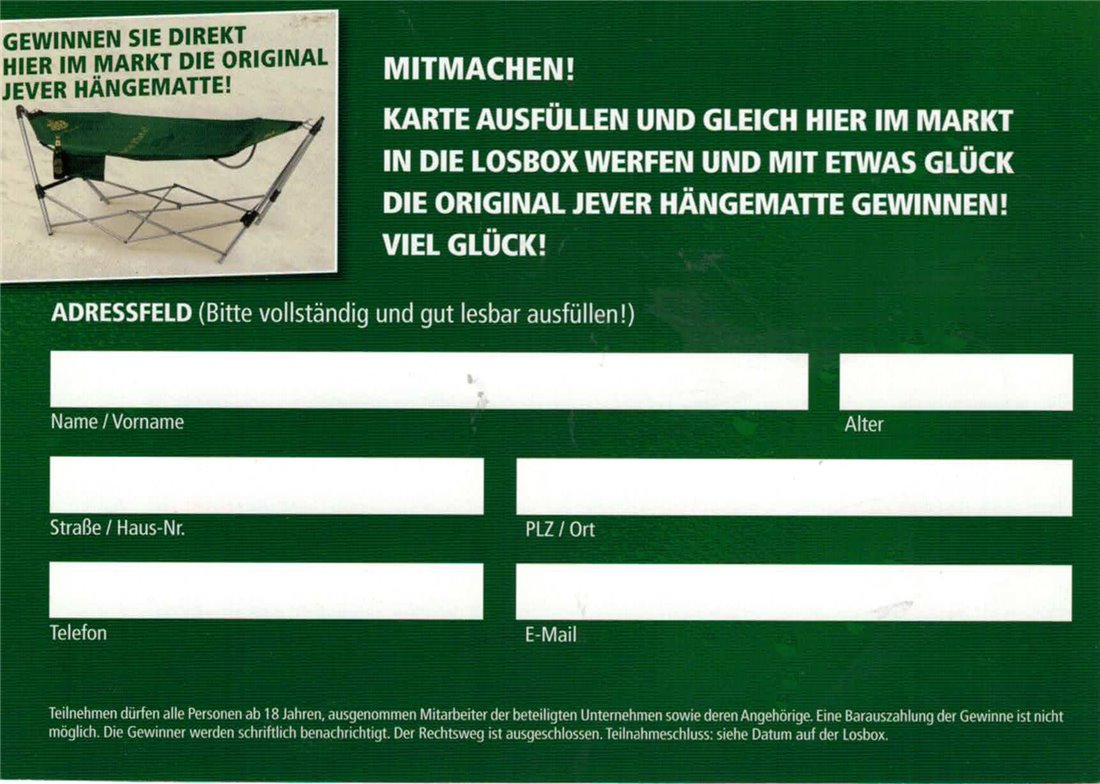 GEWINNEN SIE DIREKT HIER IM MARKT DIE ORIGINAL JEVER HÄNGEMATTE! / MITMACHEN! / KARTE AUSFÜLLEN UND GLEICH HIER IM MARKT IN DIE LOSBOX WERFEN UND MIT ETWAS GLÜCK DIE ORIGINAL JEVER HÄNGEMATTE GEWINNEN! VIEL GLÜCK! / ADRESSFELD (Bitte vollständig und gut lesbar ausfüllen!) / Name/Vorname / Alter / Straße/Haus-Nr. / PLZ/Ort / Telefon / E-Mail / Teilnehmen dürfen alle Personen ab 18 Jahren, ausgenommen Mitarbeiter der beteiligten Unternehmen sowie deren Angehörige. Eine Barauszahlung der Gewinne ist nicht möglich. Die Gewinner werden schriftlich benachrichtigt. Der rechtsweg ist ausgeschlossen. Teilnahmeschluss: siehe Datum auf der Losbox.