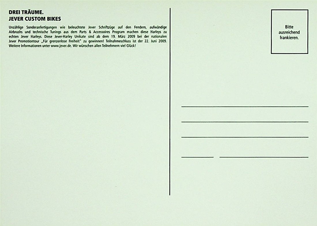 DREI TRÄUME. JEVER CUSTOM BIKES / Unzählige Sonderanfertigungen wie beleuchtete Jever Schriftzüge auf den Fendern, aufwändige Airbrushs und technische Tunings aus dem Parts & Accessoires Program machen diese Harley zu einer echten Jever Harley. Dieses Bike ist neben zwei weiteren Jever-Harley Unikaten ab dem 19. März 2019 bei der nationalen Jever Promotiontour “Für grenzenlose Freiheit” zu gewinnen! Teilnahmeschluss ist der 22. Juni 2019. Weitere Informationen unter www.jever.de. Wir wünschen allen Teilnehmern viel Glück! / Bitte ausreichend frankieren.