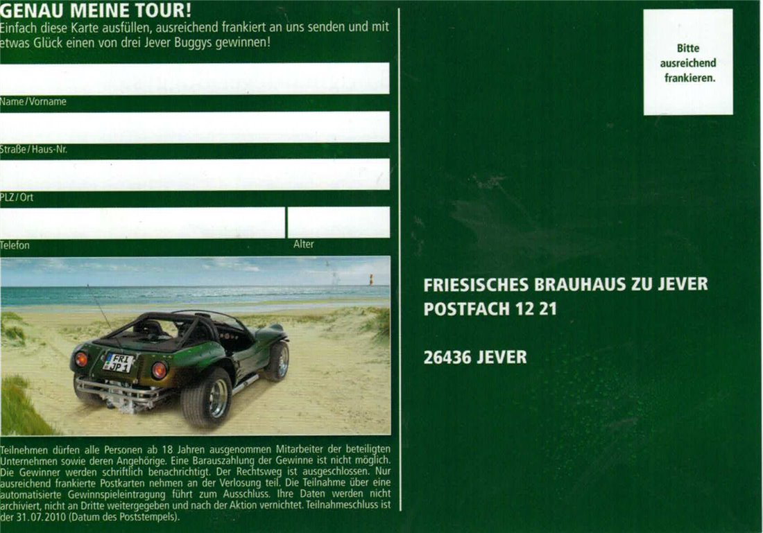 GENAU MEINE TOUR! / Einfach diese Karte ausfüllen, ausreichend frankiert an uns senden und mit etwas Glück einen von drei Buggys gewinnen! / Name/Vorname / Straße/Haus-Nr. / PLZ/Ort / Telefon / Alter / Teilnehmen dürfen alle Personen ab 18 Jahren, ausgenommen Mitarbeiter der beteiligten Unternehmen sowie deren Angehörige. Eine Barauszahlung der Gewinne ist nicht möglich. Die Gewinner werden schriftlich benachrichtigt. Der Rechtsweg ist auegschlossen. Nur ausreichend frankierte Postkarten nehmen an der Verlosung teil. Die Teilnahme über eine automatisierte Gewinnspieleintragung führt zum Ausschluss. Ihre Daten werden nicht archiviert, nicht an Dritte weitergegeben und nach der Aktion vernichtet. Teilnahmeschluss ist der 31.07.2010 (Datum des Poststempels). / Bitte ausreichend frankieren. / FRIESISCHES BRAUHAUS ZU JEVER / POSTFACH 1221 26436 JEVER