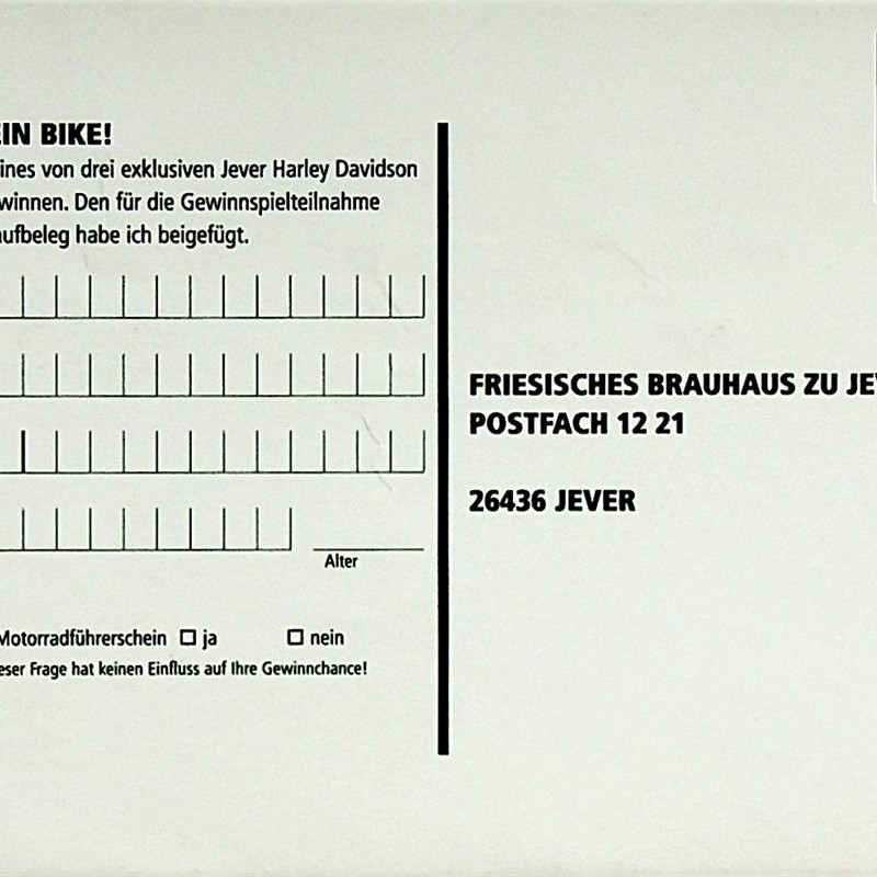 Genau mein Bike! / Ja, ich möchte eines von drei exklusiven Jever Harley Davidson Custombikes gewinnen. Den für die Gewinnspielteilnahme notwendigen Kaufbeleg habe ich beigefügt. / Name/Vorname / Straße/Haus-Nr. / PLZ/Ort / Telefon / Alter / Ich besitze einen Motorradführerschein ja nein / Die Beantwortung dieser Frage hat keinen Einfluss auf die Gewinnchance! / Bitte ausreichend frankieren. / FRIESISCHES BRAUHAUS ZU JEVER / POSTFACH 1221 26436 JEVER