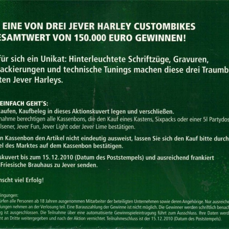 JETZT EINE VON DREI JEVER HARLEY CUSTOMBIKES IM GESAMTWERT VON 150.000 EURO GEWINNEN! / Jedes für sich ein Unikat: Hinterleuchtete Schriftzüge, Gravuren, Effektlackierungen und technische Tunings machen diese drei Traumbikes zu echten Jever Harleys. / UND SO EINFACH GEHT’S: / 1. Jever kaufen, Kaufbeleg in dieses Antwortkuvert legen und verschließen. Zur Teilnahme berechtigen alle Kassenbons, die den Kauf eines Kastens, Sixpacks oder einer 5l Partydose Jever Pilsener, Jever Fun, Jever Light oder Jever Lime bestätigen. / 2. Falls ein Kassenbon den Artikel nicht eindeutig ausweist, lassen Sie sich den Kauf bitte durch einen Stempel des Marktes auf dem Kassenbon bestätigen. / 3. Aktionskuvert bis zum 15.12.2010 (Datum des Poststempels) und ausreichend frankiert an das Friesische Brauahaus zu Jever senden. / Jever wünscht viel Erfolg! / Teilnahmebedingungen: Teilnehmen dürfen alle Personen ab 18 Jahren ausgenommen Mitarbeiter der beteiligten Unternehmen sowie deren Angehörige. Nur ausreichend frankierte Einsendungen nehmen an der Verlosung teil. Eine Barauszahlung der Gewinne ist nicht möglich. Die Gewinner werden schriftlich benachrichtigt. Der Rechtsweg ist ausgeschlossen. Die Teilnahme über eine automatisierte Gewinnspieleintragung führt zum Ausschluss. Ihre Daten werden nicht archiviert, nicht an Dritte weitergegeben und nach der Aktion vernichtet. Teilnahmeschluss ist der 15.12.2010 (Datum des Poststempels).