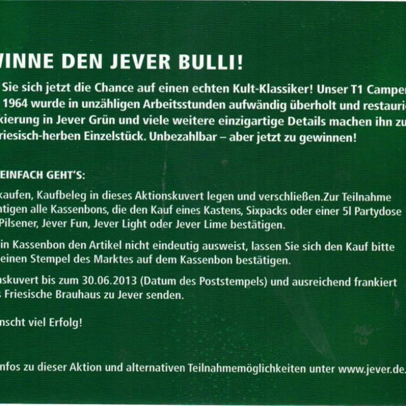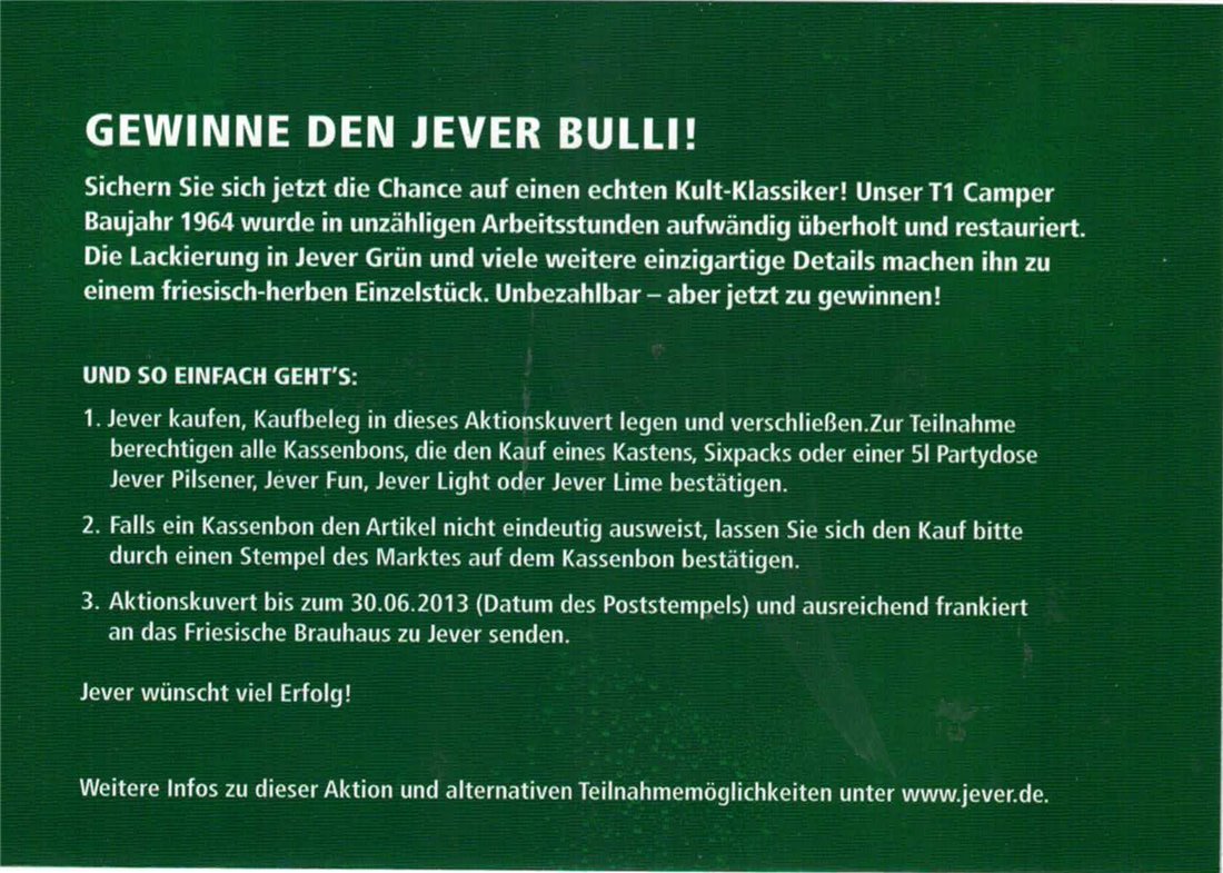 GEWINNE DEN JEVER BULLI! / Sichern Sie sich jetzt die Chance auf einen echten Kult-Klassiker! Unser T1 Camper Baujahr 1964 wurde in unzähligen Arbeitsstunden aufwändig überholt und restauriert. Die Lackierung in Jever Grün und viele weitere einzigartige Details machen ihn zu einem friesisch-herben Einzelstück. Unbezahlbar - aber jetzt zu gewinnen! / UND SO EINFACH GEHT’S: / 1. Jever kaufen, Kaufbeleg in dieses Antwortkuvert legen und verschließen. Zur Teilnahme berechtigen alle Kassenbons, die den Kauf eines Kastens, Sixpacks oder einer 5l Partydose Jever Pilsener, Jever Fun, Jever Light oder Jever Lime bestätigen. / 2. Falls ein Kassenbon den Artikel nicht eindeutig ausweist, lassen Sie sich den Kauf bitte durch einen Stempel des Marktes auf dem Kassenbon bestätigen. / 3. Aktionskuvert bis zum 30.06.2013 (Datum des Poststempels) und ausreichend frankiert an das Friesische Brauhaus zu Jever senden. / Jever wünscht viel Erfolg! / Weitere Infos zu dieser Aktion und alternativen Teilnahmemöglichkeiten unter www.jever.de.