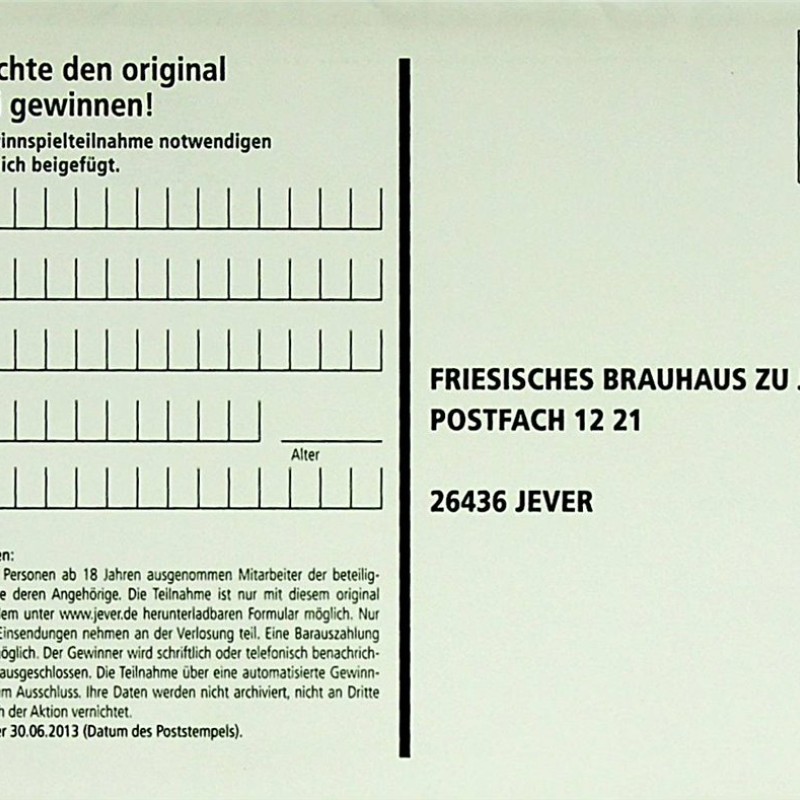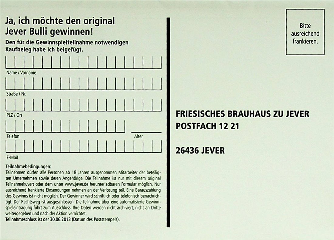 Ja, ich möchte den original Jever Bulli gewinnen. Den für die Gewinnspielteilnahme notwendigen Kaufbeleg habe ich beigefügt. / Name/Vorname / Straße/Haus-Nr. / PLZ/Ort / Telefon / Alter / E-Mail / Teilnahmebedingungen: Teilnehmen dürfen alle Personen ab 18 Jahren ausgenommen Mitarbeiter der beteiligten Unternehmen sowie deren Angehörige. Die Teilnahme ist nur mit diesem original Teilnahmekuvert oder dem unter www.jever.de herunterladbaren Formular möglich. Nur ausreichend frankierte Einsendungen nehmen an der Verlosung teil. Eine Barauszahlung des Gewinns ist nicht möglich. Der Gewinner wird schriftlich oder telefonisch benachrichtigt. Der Rechtsweg ist ausgeschlossen. Die Teilnahme über eine automatisierte Gewinnspieleintragung führt zum Ausschluss. Ihre Daten werden nicht archiviert, nicht an Dritte weitergegeben und nach der Aktion vernichtet. Teilnahmeschluss ist der 30.06.2013 (Datum des Poststempels). / Bitte ausreichend frankieren. / FRIESISCHES BRAUHAUS ZU JEVER / POSTFACH 1221 26436 JEVER