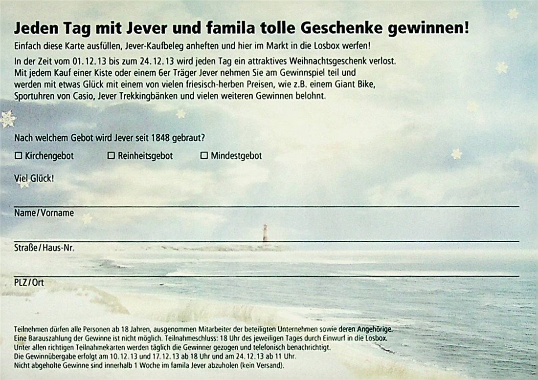 Jeden Tag mit Jever und famila tolle Preise gewinnen! / Einfach diese Karte ausfüllen, Jever-Kaufbeleg anheften und hier im Markt in die Losbox werfen! / In der Zeit vom 01.12.13 bis zum 24.12.13 wird jeden Tag ein attraktives Weihnachtsgeschenk verlost. Mit jedem Kauf einer Kiste oder einem 6er Träger Jever nehmen Sie am Gewinnspiel teil und werden mit etwas Glück mit einem von vielen friesisch-herben Preisen, wie z.B. einem Giant Bike, Sportuhren von Casio, Jever Trekkingbänken und vielen weiteren Gewinnen belohnt. / Nach welchem gebot wird Jever seit 1848 gebraut? / Kirchengebot / Reinheitsgebot / Mindestgebot / Viel Glück! / Name/Vorname / Straße/Haus-Nr. / PLZ/Ort / Teilnehmen dürfen alle Personen ab 18 Jahren, ausgenommen Mitarbeiter der beteiligten Unternehmen sowie deren Angehörige. Eine Barauszahlung der Gewinne ist nicht möglich. Teilnahmeschluss: 18 Uhr des jeweiligen Tages durch Einwurf in die Losbox. Unter allen richtigen Teilnahmekarten werden täglich die Gewinner gezogen und telefonisch benachrichtigt. Die Gewinnübergabe erfolgt am 10.12.13 und 17.12.13 ab 18 Uhr und am 24.12.13 ab 11 Uhr. Nicht abgeholte Gewinne sind innerhalb 1 Woche im famila Jever abzuholen (kein Versand).