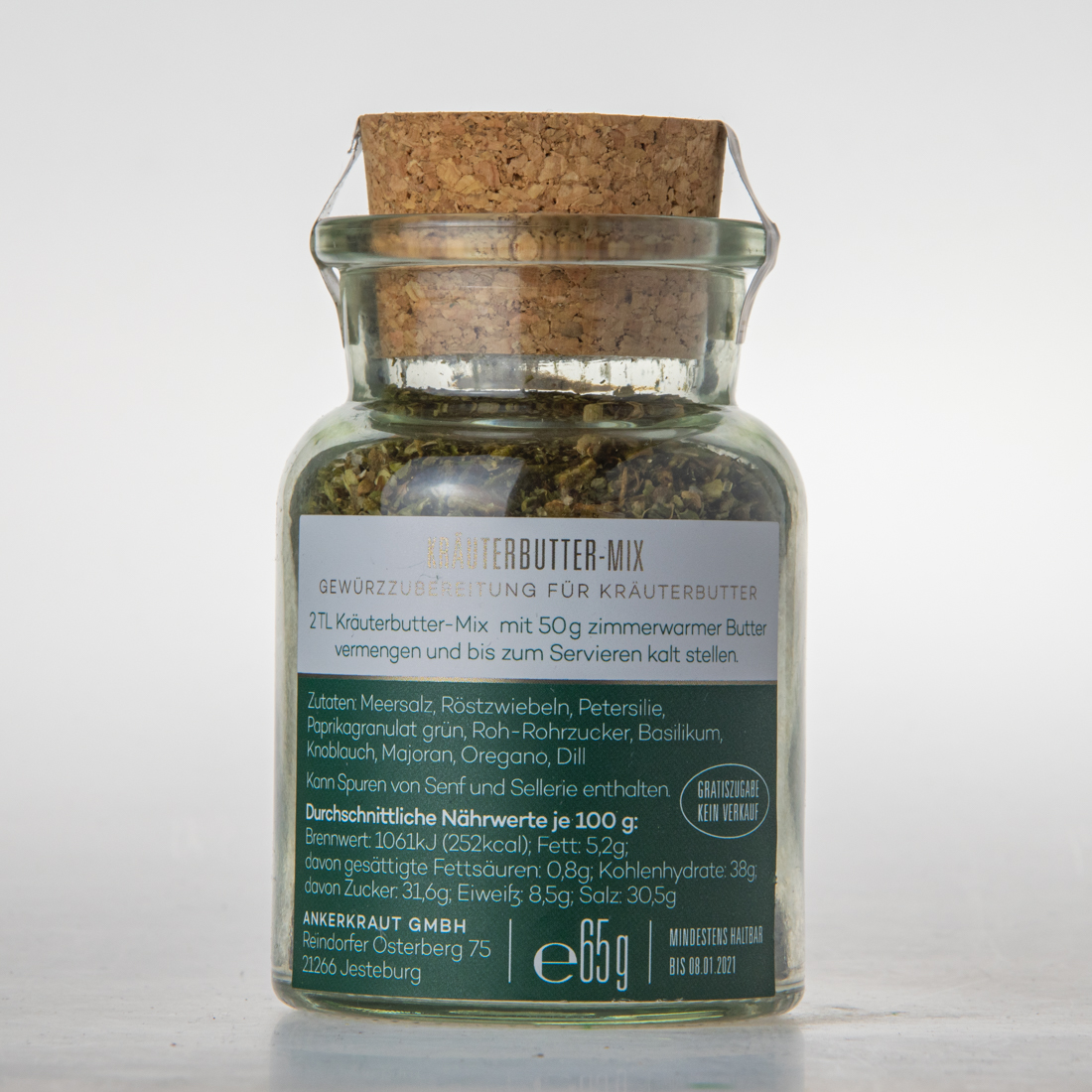 KRÄUTERBUTTER-MIX / GEWÜRZZUBEREITUNG FÜR KRÄUTERBUTTER / 2 TL Kräuterbutter-Mix mit 50g zimmerwarmer Butter vermengen und bis zum Servieren kalt stellen. / Zutaten: Meersalz, Röstzwiebeln, Petersilie, Paprikagranulat grün, Roh-Rohrzucker, Basilikum, Knoblauch, Majoran, Oregano, Dill. / Kann Spuren von Senf und Sellerie enthalten. / Durchschnittliche Nährwerte je 100g: Brennwert 1061kJ (252kcal), Fett 5,2g davon gesättigte Fettsäuren 0,8g Kohlenhydrate 38g davon Zucker 31,6g Eiweiß 8,5g Salz 30,5g / ANKERKRAUT GMBH Reindorfer Osterberg 75 21266 Jesteburg / e 65g / MINDESTENS HALTBAR BIS 08.01.2021