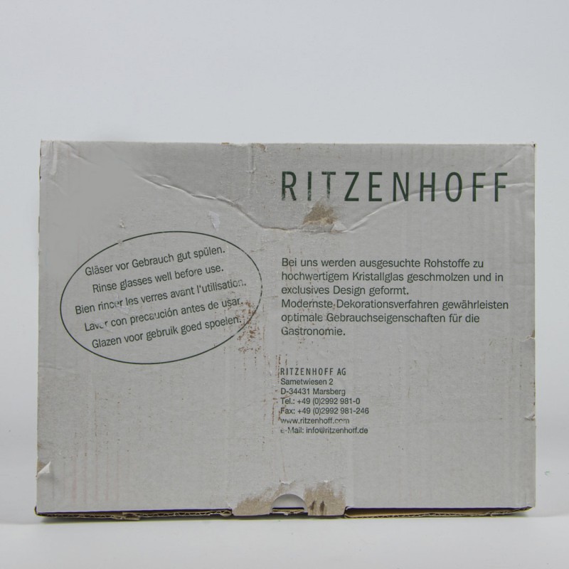 RITZENHOFF / Bei uns werden ausgesuchte Rohstoffe zu hochwertigem Kristallglas geschmolzen und in exclusives Design geformt. Modernste Dekorationsverfahren gewährleisten optimale Gebrauchseigenschaften für die Gastronomie. / Gläser vor Berauch gut spülen. / Rinse glasses well before use. / … / RITZENHOFF AG / Sametwiesen 2 / D-34431 Marsberg / Tel.: (02992) 981 - 0 / FaX (02992) 981 - 246 / www.ritzenhoff.com / e-Mail: info@ritzenhoff.com