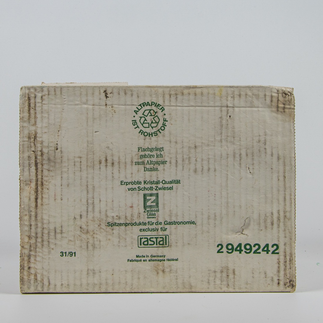 ALTPAPIER IST ROHSTOFF / Flachgelegt gehöre ich zum Altpapier Danke. / Erprobte Kristall-Qualität von Schott-Zwiesel / Zwiesel Glas Germany / Spitzenprodukte für die Gastronomie, exclusiv für rastal / 31/91 / 2 949242 / Made in germany / Fabrique in allemagne federal