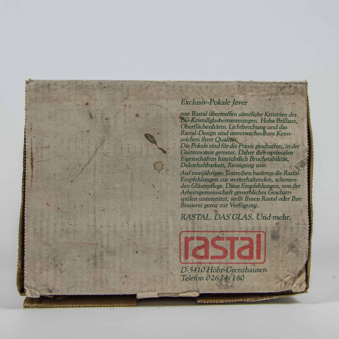 Gehört zu Glas G0138. Der Karton passt im Prinzip zu allen Rastal-Gläsern des Typs “Exclusiv-Pokal” in der Größe 0,25l.