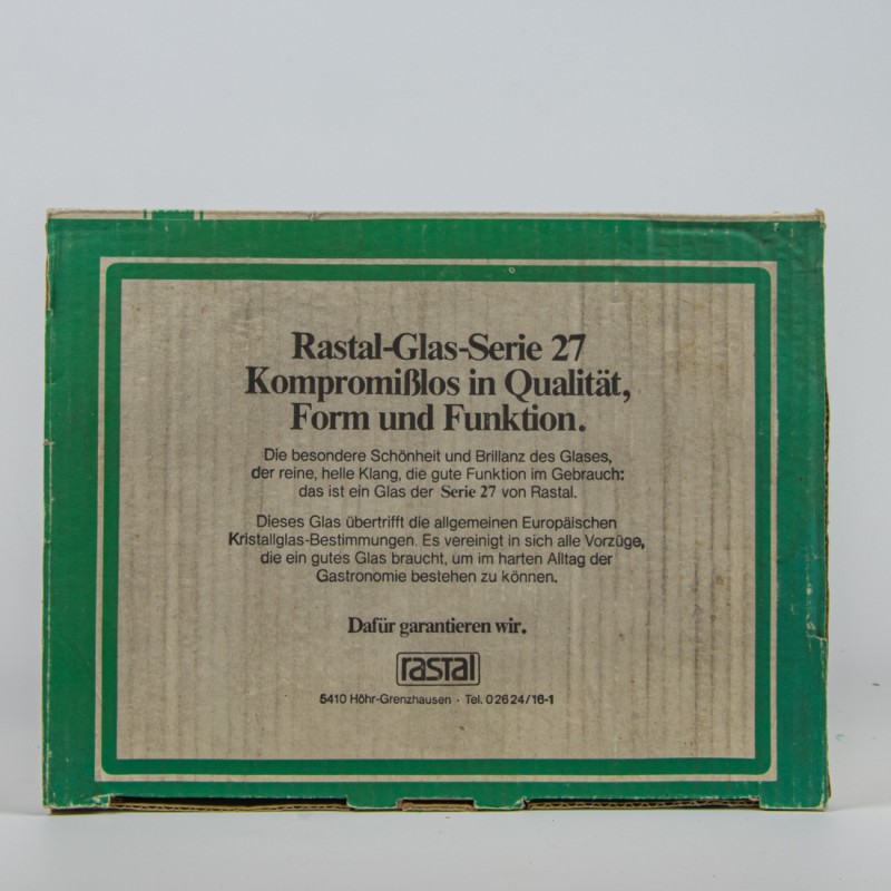 Rastal-Glas-Serie 27 / Kompromißlos in Qualität, Form und Funktion. / Die besondere Schönheit und Brillanz des Glases, der reine, helle Klang, die gute Funktion im Gebrauch: das ist ein Glas der Serie 27 von Rastal. / Dieses Glas übertrifft die allgemeinen Europäischen Kristallglas-Bestimmungen. Es vereinigt in sich alle Vorzüge, die ein gutes Glas braucht, um im harten Alltag der Gastronomie bestehen zu können. / Dafür garantieren wir. / rastal / 5410 Höhr-Grenzhausen Tel. 02624/16-1