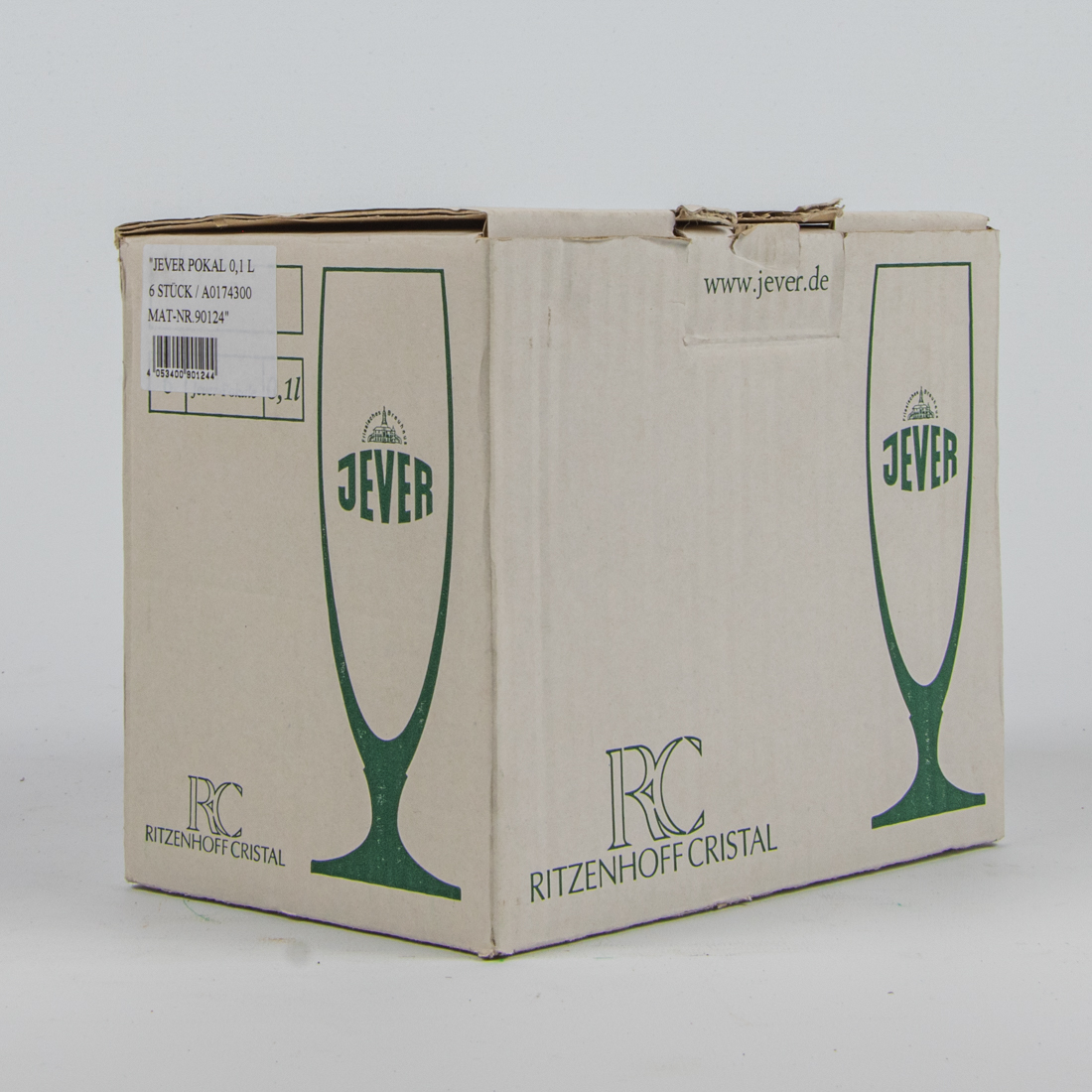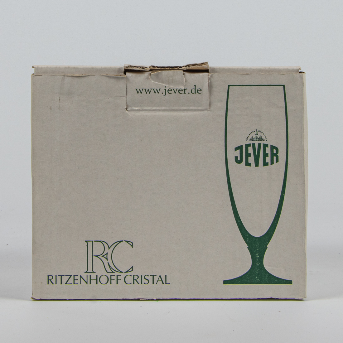 Gehört zu Glas G0063. Der Karton passt im Prinzip zu allen Ritzenhoff-Gläsern des Typs “Jever-Pokal” in der Größe 0,1l. Der Eichstrich ist entweder “JEVER”, “RC” oder “RITZENHOFF”.
