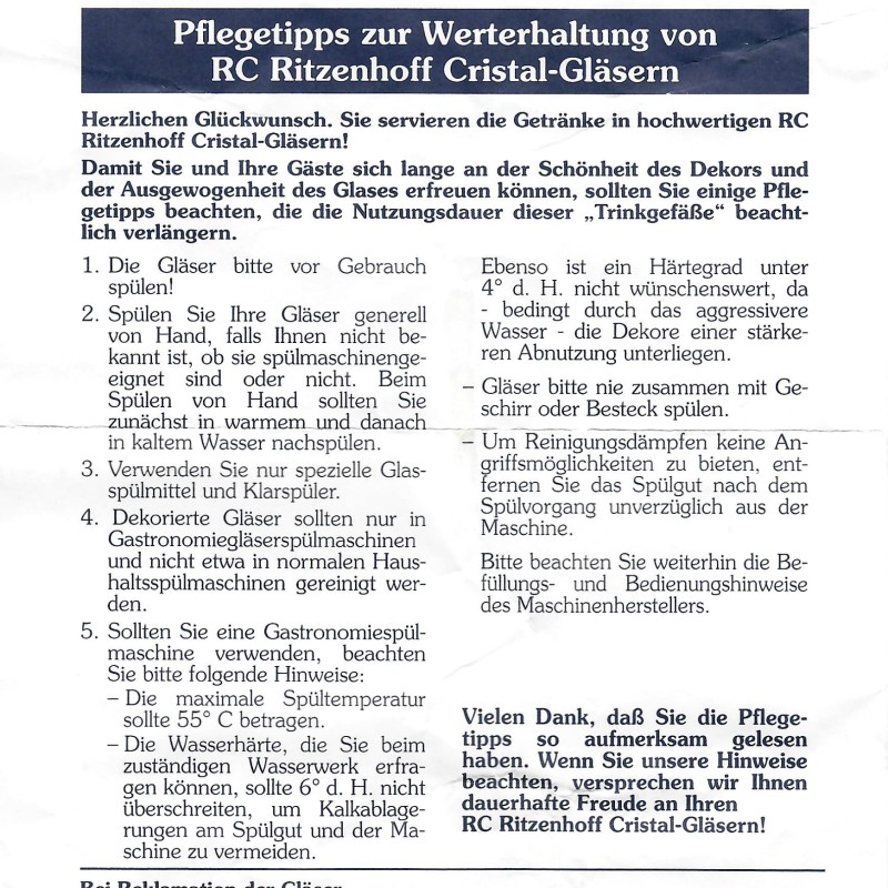 RC / RITZENHOFF CRISTAL AG / Pflegetipps zur Werterhaltung von RC Ritzenhoff Cristal-Gläsern / Herzlichen Glückwunsch. Sie servieren die Getränke in hochwertigen RC Ritzenhoff Cristal-Gläsern! / Damit Sie und Ihre Gäste sich lange an der Schönheit des Dekors und der Ausgewogenheit des Glases erfreuen können, sollten Sie einige Pflegetipps beachten, die die Nutzungsdauer dieser “trinkgefäße” beachtlich verlängern. / 1. Die Gläser bitte vor dem gebrauch spülen! / 2. Spülen Sie Ihre Gläser generell von hand, falls Ihnen nicht bekannt ist, ob sie spülmaschinengeeignet sind oder nicht. Beim Spülen von Hand sollten Sie zunächst in warmem und danach in kaltem Wasser nachspülen. / 3. Verwenden Sie nur spezielle Glasspülmittel und Klarspüler. / 5. Sollten Sie eine Gastronomie-Spülmaschine verwenden, beachten Sie bitte folgende Hinweise: / - Die maximale Spültemperatur sollte 55° C betragen. / - Die Wasserhärte, die Sie beim zuständigen Wasserwerk erfragen können, sollte 6° d.H. nicht überschreiten, um Kalkablagerungen am Spülgut und der Maschine zu vermeiden. Ebenso ist ein Härtegrad unter 4° d.H. nicht wünschenswert, da - bedingt durch das aggressivere Wasser - die Dekore einer stärkeren Abnutzung unterliegen. / - Gläser bitte nie zsuammen mit Geschirr oder Besteck spülen. / - Um Reinigungsdämpfen keine Angriffsmöglichkeiten zu bieten, entnehmen Sie das Spülgut nach dem Spülvorgang unverzüglich aus der Maschine. Bite beachten Sie weiterhin die Befüllungs- und Bedienungshinweise des Maschinenherstellers. / Vielen Dank, daß Sie die Pflegetipps so aufmerksam gelesen haben. Wenn Sie unsere Hinweise beachten, versprechen wir Ihnen dauerhafte Freude an Ihren RC Ritzenhoff Cristal-Gläsern! / Bei Reklamation der Gläser bitte Kontrollzettel zurücksenden. / RC RITZENHOFF CRISTAL AG / Essentho, Postfach 1344 - 34419 Marsberg / Telefon (02992) 981-0