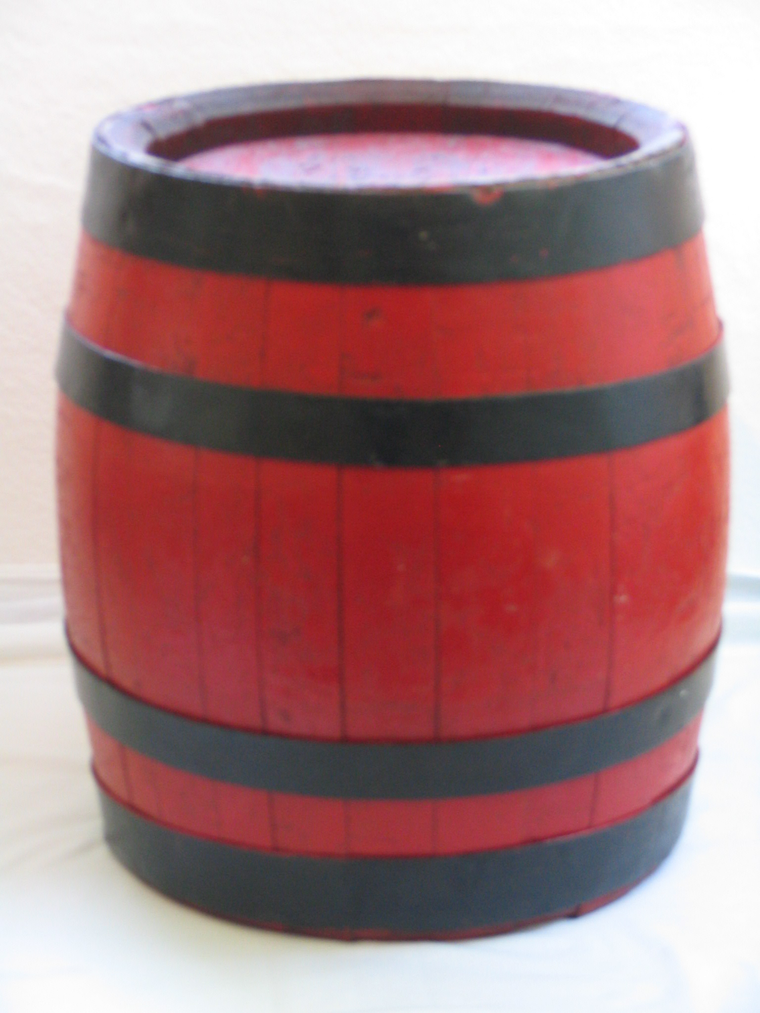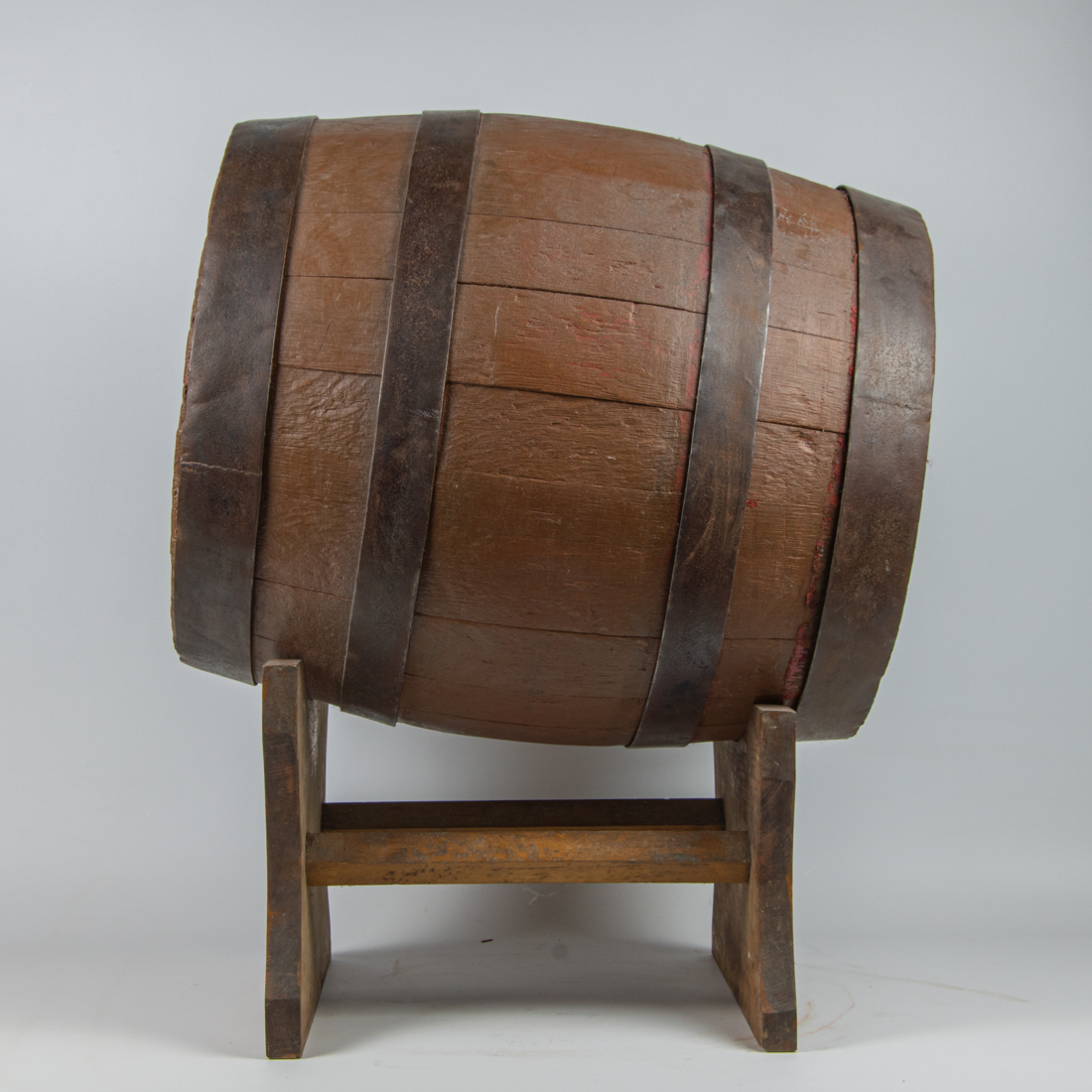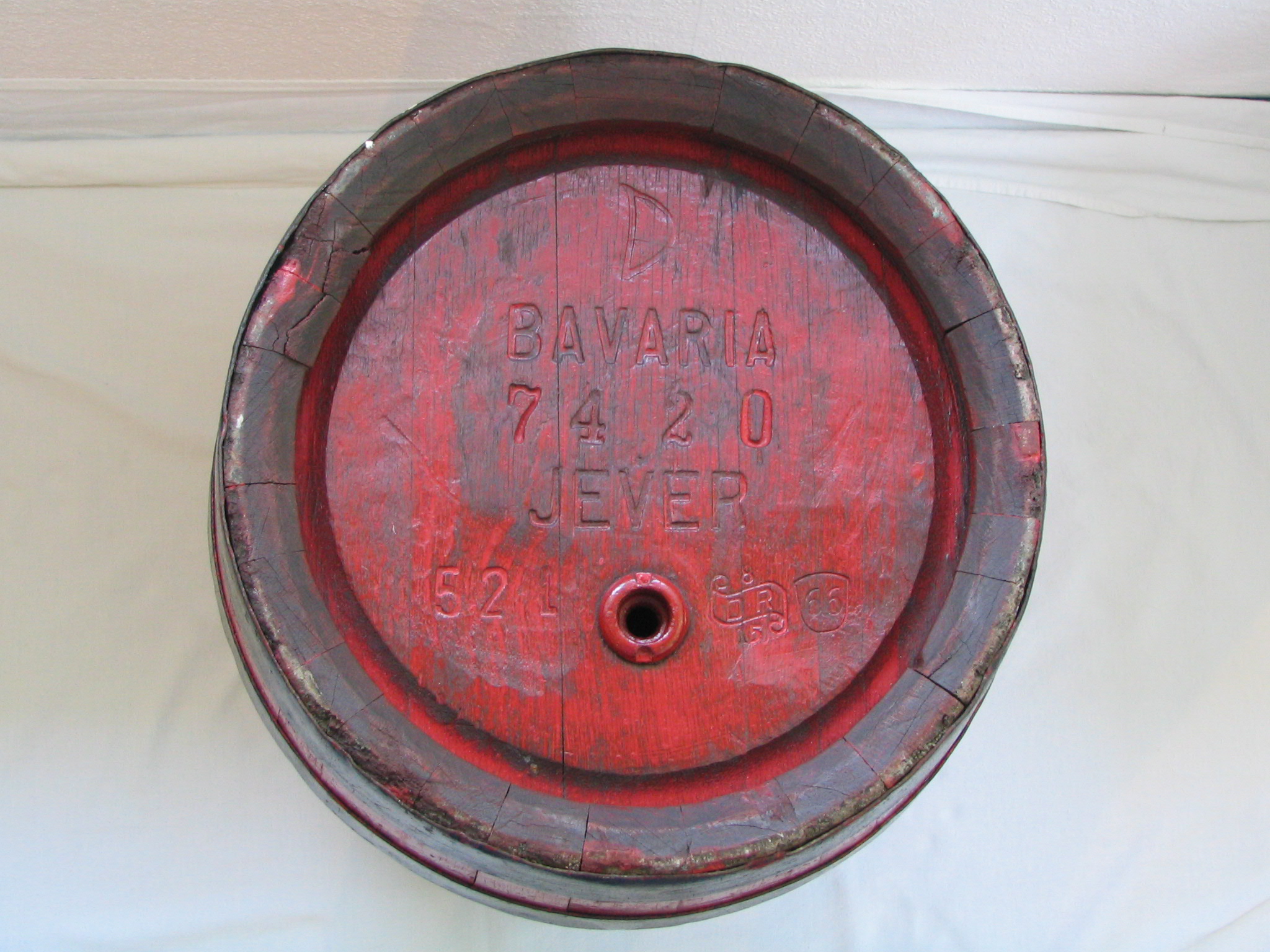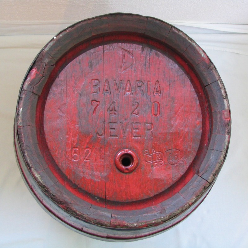 Die etwas ungeraden Inhalte der Holzfässer kamen dadurch zustande, dass die Fässer nach der Herstellung durch den Böttcher von innen mit Pech beschichtet wurden, damit sie dicht sind. Dies war nicht so genau zu steuern, sodass der Inhalt eines jeden Fasses einzeln festgestellt und am Fass notiert werden musste. Auf der Unterseite ist noch die typische rote Bavaria-Farbe zu sehen. Das Fass wurde später in einen “gängigen” Farbton (braun) umgestrichen. Der auf dem Bild zu sehende Bock ist genaugenommen nicht von Jever, aber in der Alterskategorie darf man nicht zu wählerisch sein. Immerhin ist er aus dem gleichen Unternehmen, nur eben aus Hamburg.