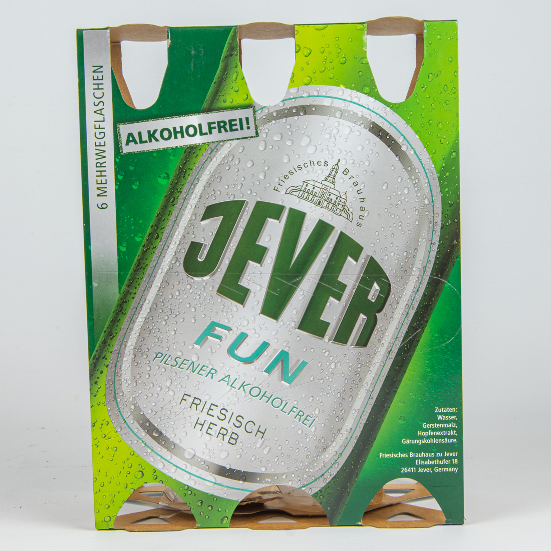 6 MEHRWEGFLASCHEN / ALKOHOLFREI! / Friesisches Brauhaus / JEVER / FUN / PILSENER ALKOHOLFREI / FRIESISCH HERB / Zutaten: Wasser, Gerstenmalz, Hopfenextrakt, Gärungskohlensäure. / Friesisches Brauhaus zu Jever Elisabethufer 18 26441 Jever, Germany