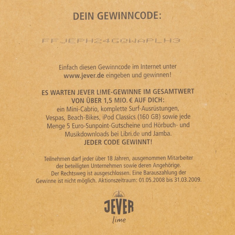 DEIN GEWINNCODE: … / Einfach dieses Gewinncode im Internet unter www.jever.de eingeben und gewinnen! / ES WARTEN JEVER LIME-GEWINNE IM GESAMTWERT VON ÜBER 1,5 MIO. € AUF DICH: ein Mini-Cabio, komplette Surfausrüstungen, Vespas, Beach-Bikes, iPod Classics (160 GB) sowie jede Menge 5 Euro-Sunpoint-Gutscheine und Hörbuch- und Musikdownloads bei Libri.de und Jamba. / JEDER CODE GEWINNT! / Teilnehmen darf jeder über 18 Jahren, ausgenommen Mitarbeiter der beteiligten Unternehemn sowie deren Angehörige. Der Rechtsweg ist ausgeschlossen. Eine Barauszahlung der Gewinne ist nicht möglich. Aktionszeitraum: 01.05.2008 bis 31.03.2009. / Friesisches Brauhaus / JEVER / lime