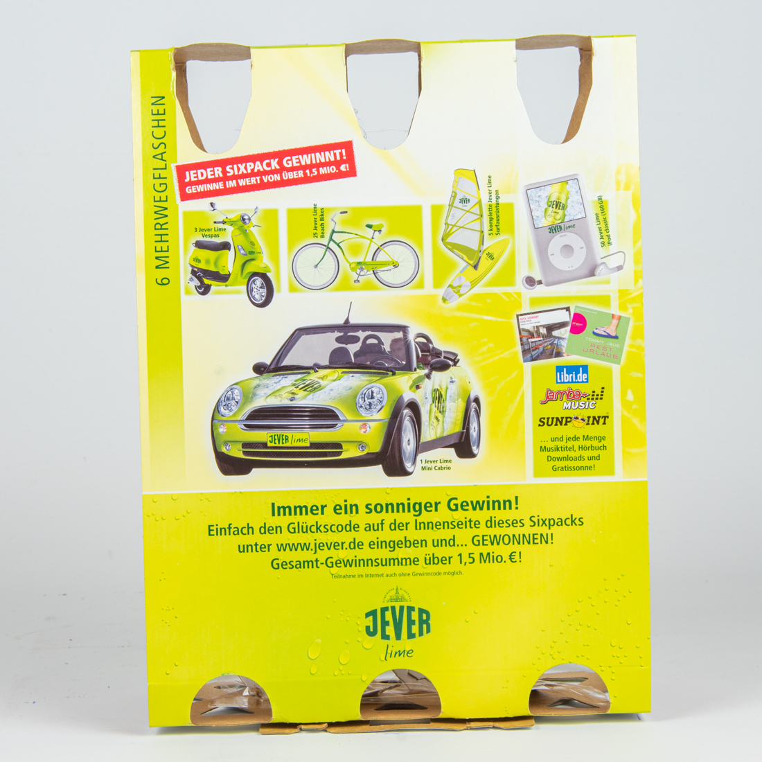 6 MEHRWEGFLASCHEN / JEDER SIXPACK GEWINNT! GEWINNE IM WERT VON ÜBER 1,5 MIO. €! / 3 Jever Lime Vespas / 25 Jever Lime Beach Bikes / 5 komplette Jever Lime Surfausrüstungen / 50 Jever Lime iPods classic (160GB) / 1 Jever lime Mini Cabrio / Libri.de Jamba MUSIC SUNPOINT …und jede Menge Musiktitel, Hörbuch Downloads und Gratissonne! / Immer ein sonniger Gewinn! Einfach den Glückscode auf der Innenseite dieses Sixpacks unter www.jever.de eingeben und… GEWONNEN! Gesamt-Gewinnsumme über 1,5 Mio. €! / Teilnahme im Internet auch ohne Gewinncode möglich. / Friesisches Brauhaus / JEVER / lime