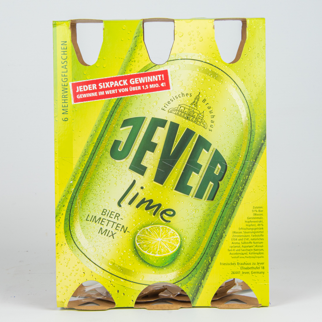 6 MEHRWEGFLASCHEN / JEDER SIXPACK GEWINNT! GEWINNE IM WERT VON ÜBER 1,5 MIO. €! / Friesisches Brauhaus / JEVER / lime / BIER-LIMETTEN-MIX / Biermischgetränk mit Süßungsmitteln / Zutaten: 51% Bier (Wasser, Gerstenmalz, Hopfenextrakt, Hopfen), 49% Erfrischungsgetränk (Wasser, Säuerungsmittel Zitronensäure, Farbstoffe E104 und E141, natürliches Aroma, Süßstoffe Natriumcyclamat, Aspartam*, Acesulfam-K und Saccharin-Natrium, Ascorbinsäure), Kohlensäure. * enthält eine Phenylalaninquelle. / Friesisches Brauhaus zu Jever Elisabethufer 18 26441 Jever, Germany