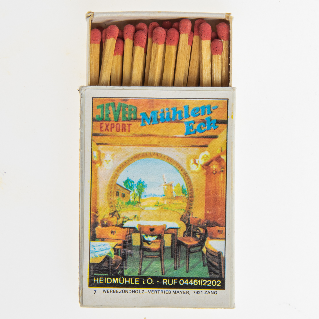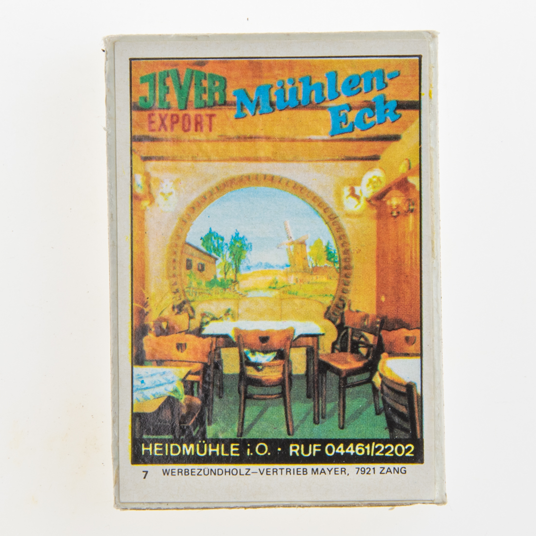 Attribut Wert Alter (min.) Alter (max.) Identifikation (Jever-Fan) ID I003848 / S1360 / B53 Typ Streichhölzer Attribute (Allgemein) Form Quader Gastronomie Mühlen-Eck Herstellername Werbezündholz-Vertrieb Mayer Logo Export 1 Maße HxBxT (cm) 5,1x3,6x1,2 Material Papier/Pappe Ort Heidmühle > Schortens > Landkreis Friesland > Niedersachsen > Deutschland Sorte Export