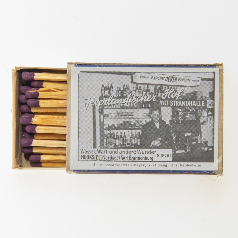 Attribut Wert Alter (min.) Alter (max.) Identifikation (Jever-Fan) ID I003853 / S1365 / B53 Typ Streichhölzer Attribute (Allgemein) Form Quader Gastronomie Jeverländischer Hof Herstellername Werbezündholz-Vertrieb Mayer Maße HxBxT (cm) 3,6x5,1x1,2 Material Papier/Pappe Ort Hooksiel > Wangerland > Landkreis Friesland > Niedersachsen > Deutschland Slogan Würzig stark Sorte Export