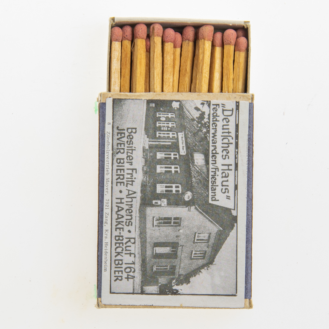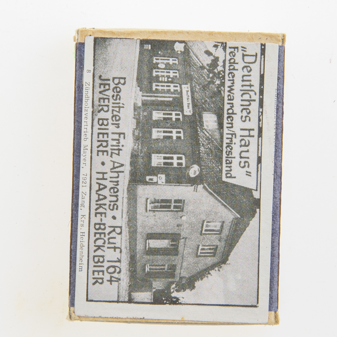 Attribut Wert Alter (min.) Alter (max.) Identifikation (Jever-Fan) ID I003861 / S1373 / B53 Typ Streichhölzer Attribute (Allgemein) Form Quader Gastronomie Deutsches Haus Herstellername Werbezündholz-Vertrieb Mayer Maße HxBxT (cm) 3,6x5,1x1,2 Material Papier/Pappe Ort Fedderwarden > Wilhelmshaven > Landkreis Friesland > Niedersachsen > Deutschland Sorte (Dachmarke)