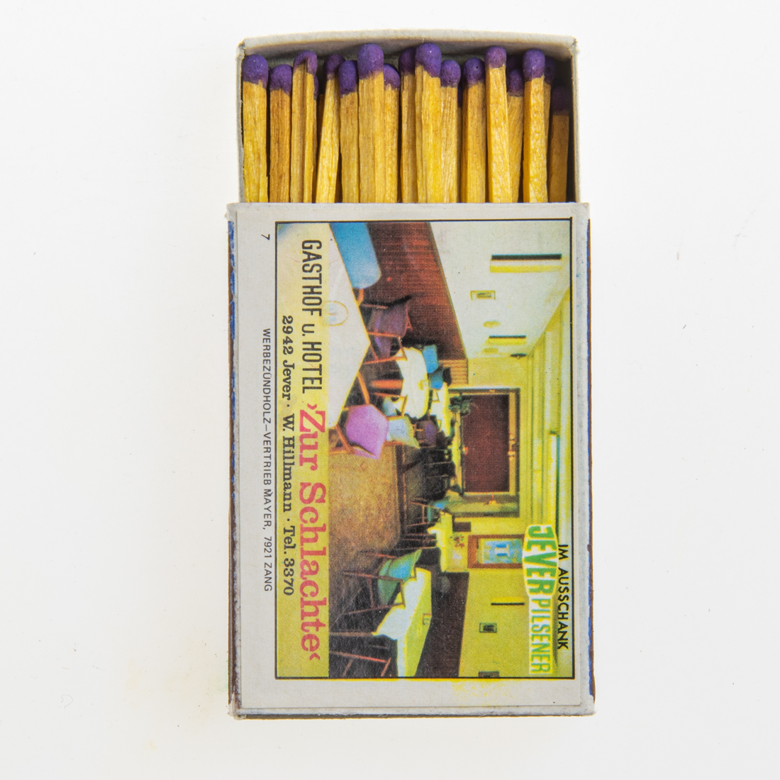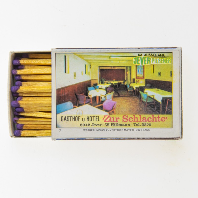 Attribut Wert Alter (min.) Alter (max.) Identifikation (Jever-Fan) ID I003864 / S1376 / B53 Typ Streichhölzer Attribute (Allgemein) Form Quader Gastronomie Zur Schlachte Herstellername Werbezündholz-Vertrieb Mayer Logo Pilsener 17 Maße HxBxT (cm) 3,6x5,1x1,2 Material Papier/Pappe Ort Jever > Jever > Landkreis Friesland > Niedersachsen > Deutschland Sorte Pilsener