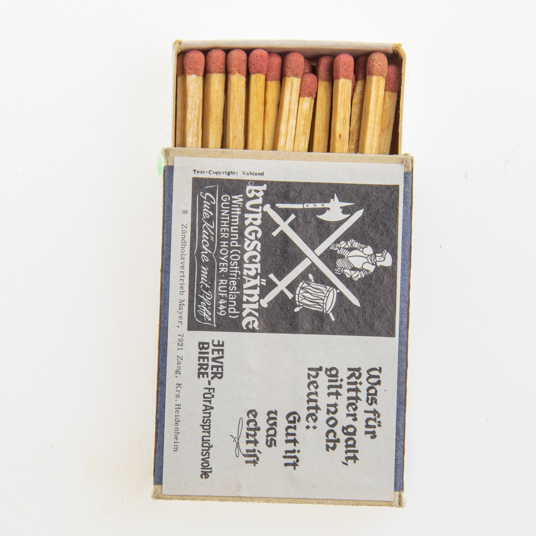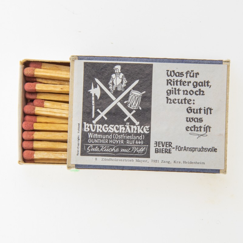 Attribut Wert Alter (min.) Alter (max.) Identifikation (Jever-Fan) ID I003868 / S1381 / B53 Typ Streichhölzer Attribute (Allgemein) Form Quader Gastronomie Burgschänke Herstellername Werbezündholz-Vertrieb Mayer Maße HxBxT (cm) 3,6x5,1x1,2 Material Papier/Pappe Ort Wittmund > Wittmund > Landkreis Wittmund > Niedersachsen > Deutschland Slogan Für Anspruchsvolle Sorte (Dachmarke)