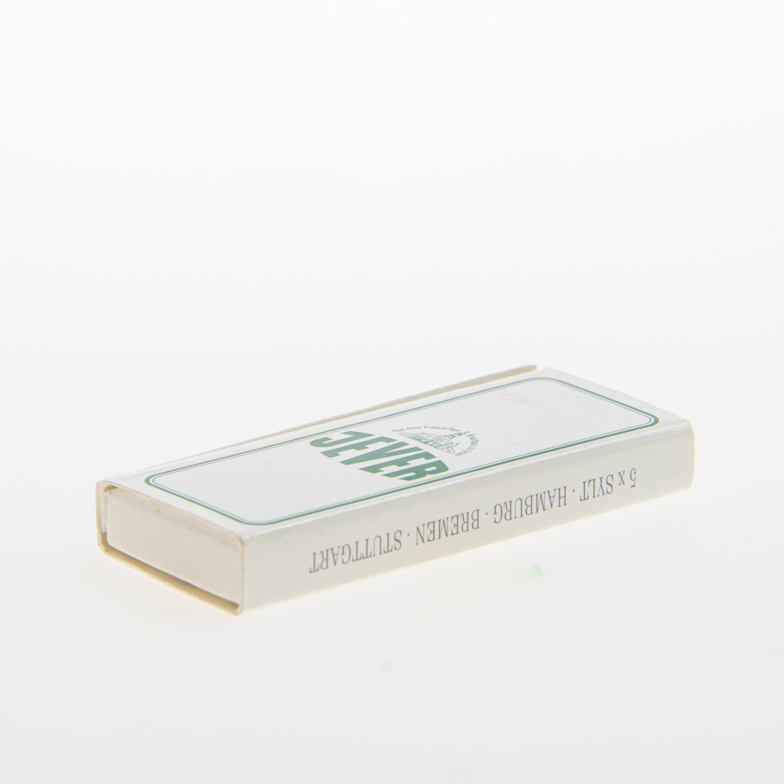 Attribut Wert Alter (min.) Alter (max.) Identifikation (Jever-Fan) ID I003875 / S1388 / B53 Typ Streichhölzer Attribute (Allgemein) Form Quader Logo Dachmarke 2 Maße HxBxT (cm) 5,5x2,4x0,8 Material Papier/Pappe Ort Sylt > Sylt > Kreis Nordfriesland > Schleswig-Holstein > Deutschland Sorte (Dachmarke)