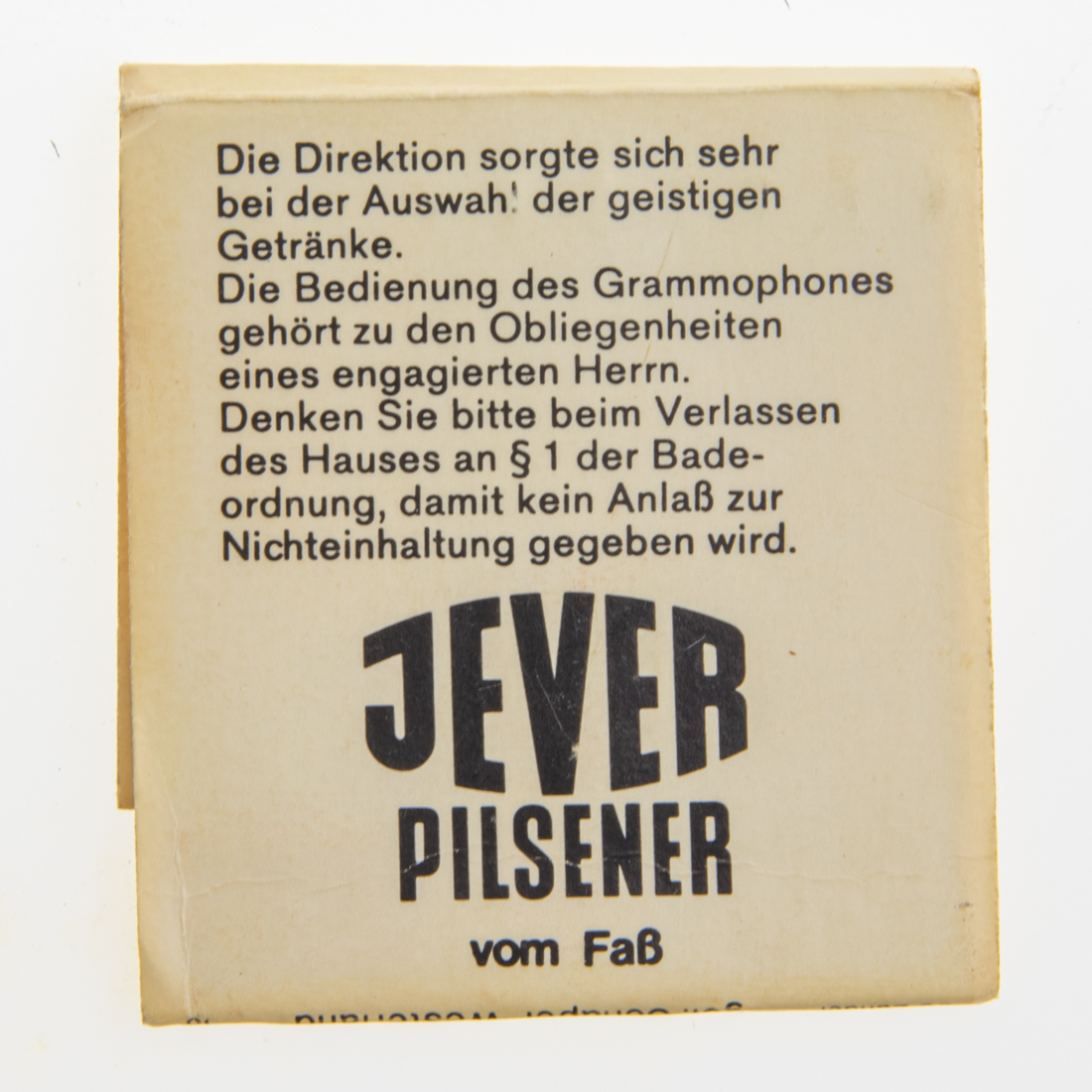 Die Direktion sorgte sich sehr bei der Auswahl der geistigen Getränke. Die Bedienung des Grammophones gehört zu den Obliegenheiten eines engagierten Herrn. Denken Sie bitte beim Verlassen des Hauses an § 1 der Badeordnung, damit kein Anlaß zur Nichteinhaltung gegeben wird. / JEVER / PILSENER / vom Faß