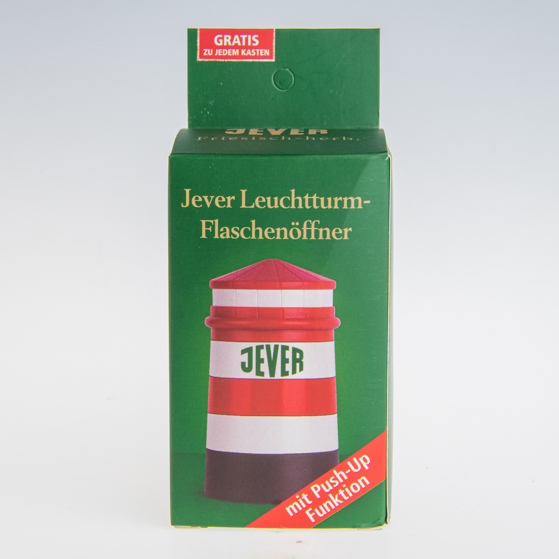 GRATIS ZU JEDEM KASTEN / Jever Leuchtturm-Flaschenöffner / mit Push-Up Funktion / So funktioniert’s: / Friesisch-herb. / Grell Werbemittel GmbH & Co. KG / Avenwedder Straße 366 / DE-33335 Gütersloh / www.grell-werbemittel.de