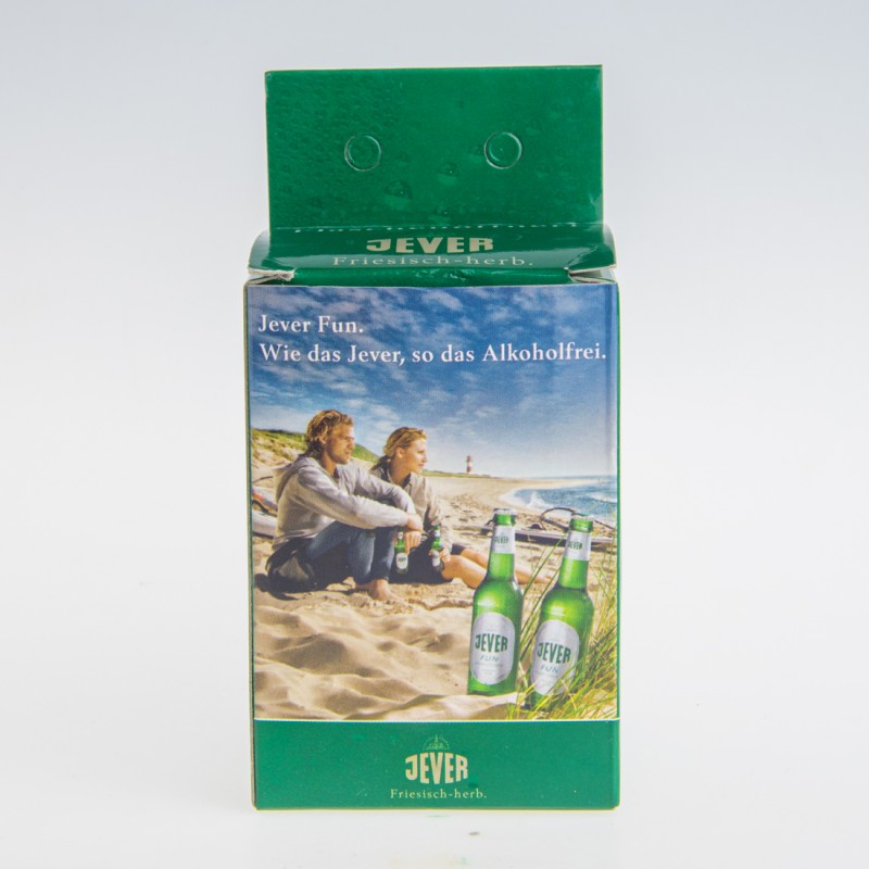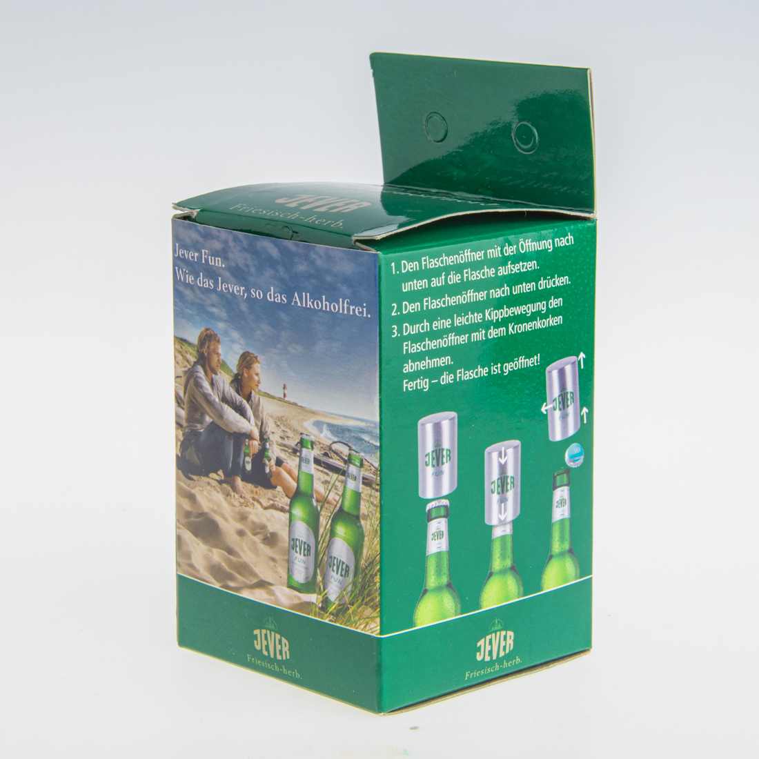 Jever Fun. / Wie das Jever, so das Alkoholfrei. / Friesisches Brauhaus / JEVER / Friesisch-herb. / 1. Den Flaschenöffner mit der Öffnung nach unten auf die Flasche aufsetzen. / 2. Den Flaschenöffner nach unten drücken. / 3. Durch eine leichte Kippbewegung den den Flaschenöffner mit dem Kronenkorken abnehmen. Fertig - die Flasche ist geöffnet! / CE / GRELL WERBEMITTEL / D-33663 Bielefeld