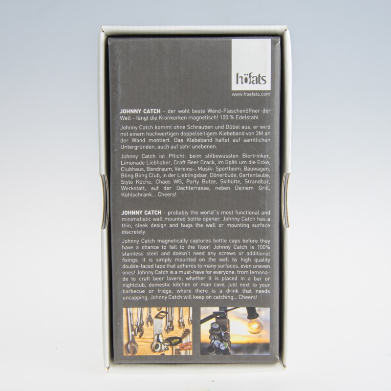 höfats / www.hoefats.com / JOHNNY CATCH - der wohl beste Wand-Flaschenöffner der Welt - fängt die Kronkorken magnetisch! 100 % Edelstahl / Johnny Catch kommt ohne Schrauben und Dübel aus, er wird mit einem hochwertigen doppelseitigen Klebeband von 3M an der Wand montiert. Das Klebeband haftet auf sämtlichen Untergründen, auch auf sehr unebenen. / Johnny Catch ist Pflicht: beim stilbewussten Biertrinker, Limonade Liebhaber, Craft Beer Crack, im Späti um die Ecke, Clubhaus, Bandraum, Vereins-, Musik- Sportheim, Bauwagen, Bling Bling Club, in der Lieblingsbar, Dönerbude, Gartenlaube, Stylo Küche, Chaos WG, Party Butze, Skihütte, Strandbar, Werkstatt, auf der Dachterrasse, neben Deinem Grill, Kühlschrank… Cheers! / JOHNNY CATCH - probably the world’s most functional and minimalistic wall mounted botte opener. … / reddot design award winner 2015