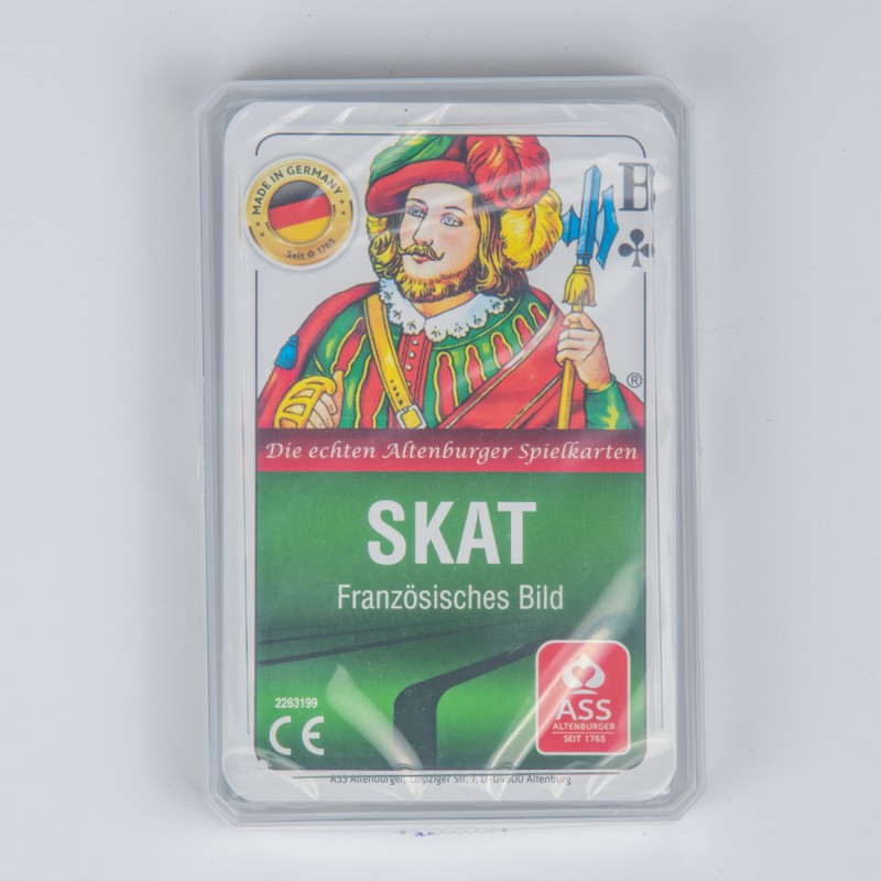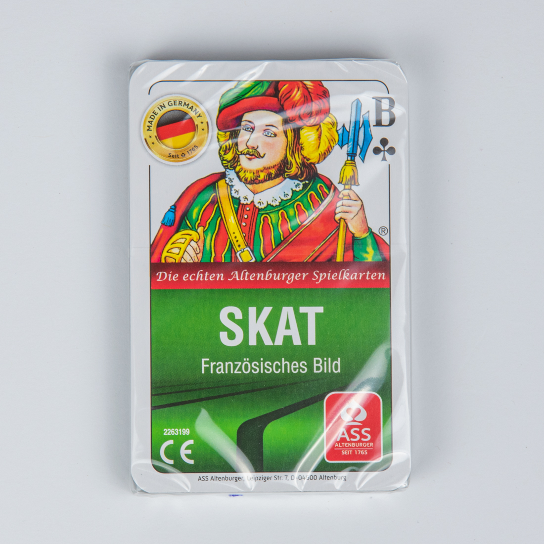 MADE IN GERMANY / Seit 1765 / Die echten Altenburger Spielkarten / SKAT / Französisches Bild / ASS / Altenburger / SEIT 1765 / 2263199 / CE / ASS ALtenburger, Leipziger Str. 7, D-04500 Altenburg