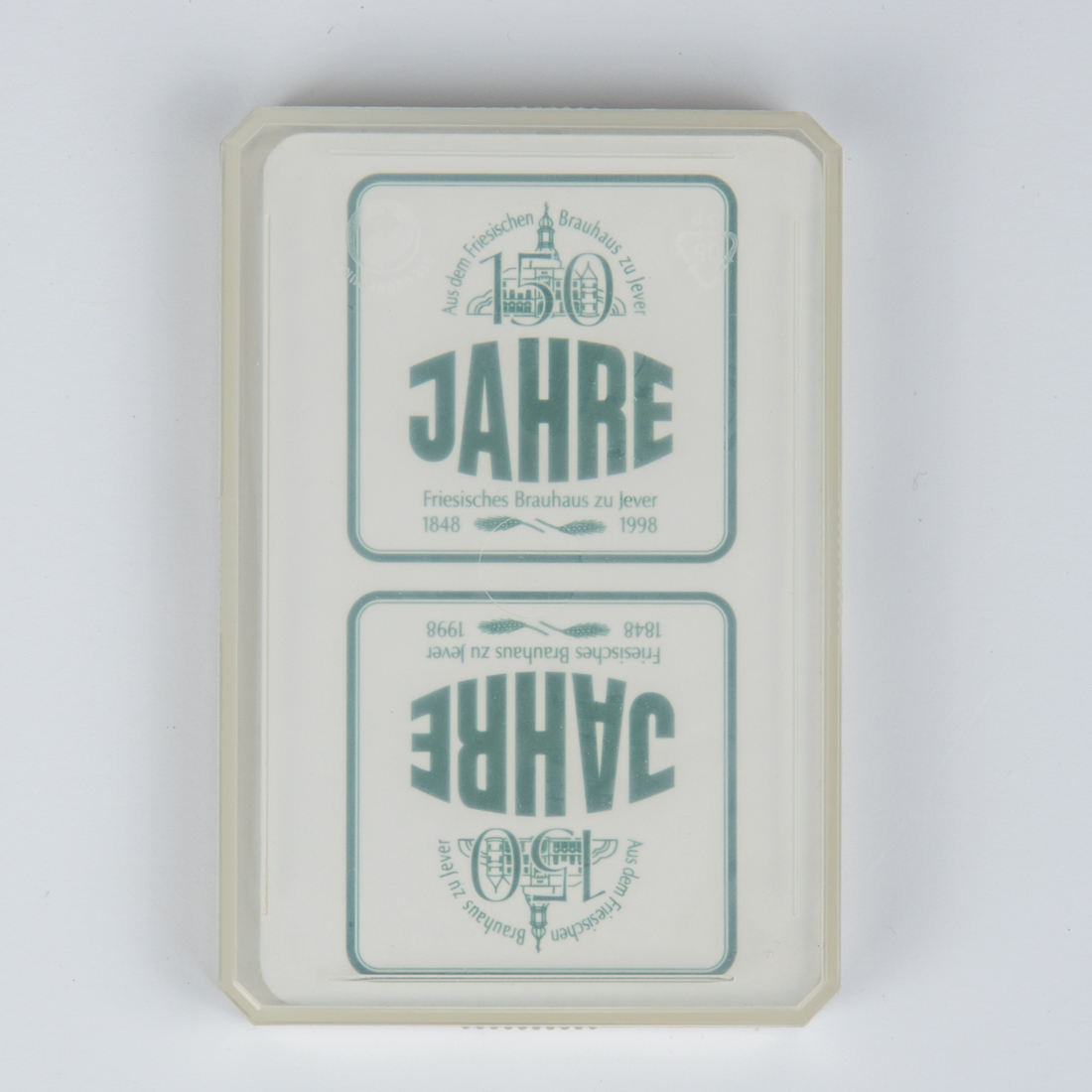 Attribut Wert Alter (min.) Alter (max.) Identifikation (Jever-Fan) ID I004046 / S1567 / B54 Typ Skat-Spiel Attribute (Allgemein) Event 150 Jahre Friesisches Brauhaus zu Jever Herstellername F.X. Schmid Vereinigte Münchener Spielkarten-Fabriken GmbH & Co. Logo Dachmarke 4 Maße HxBxT (cm) 9,1x5,9x0,9 Material Papier/Pappe Sorte (Dachmarke) Attribute (Zeitstempel) Eigene 19980000 1998 1998