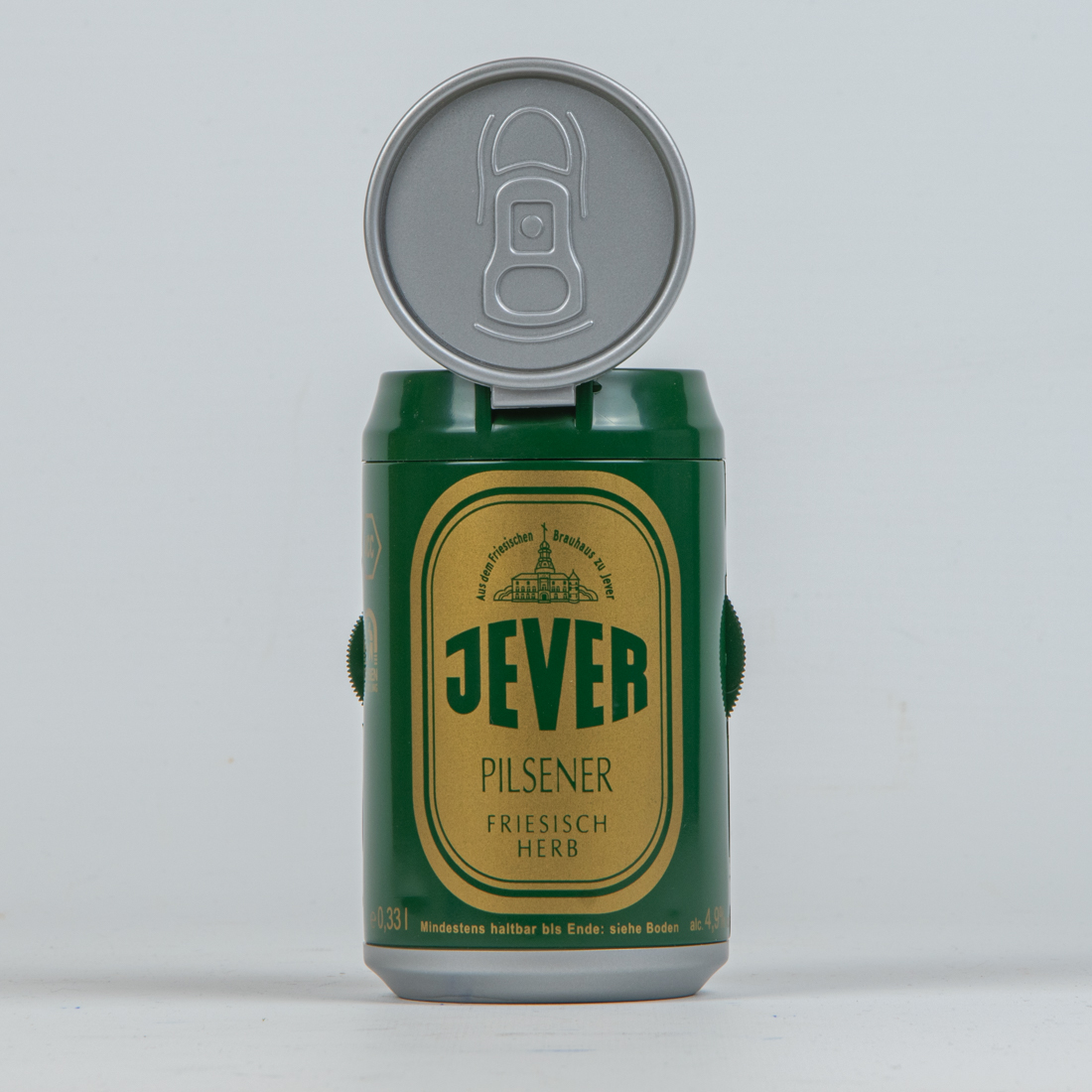Radio in der Optik einer Bierdose. Lautsprecher und Antenne sind unter dem aufklappbaren Deckel versteckt.