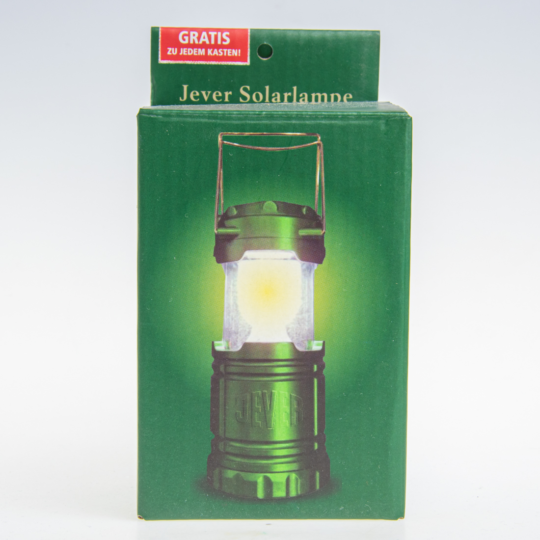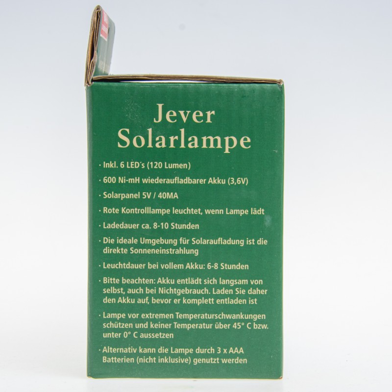 GRATIS ZU JEDEM KASTEN / Jever Solarlampe / Inkl. 6 LEDS’s (120 Lumen) / 600 No-mH wiederaufladbar Akku (3,6V) / Solarpanel 5V/40 MA / Rote Kontrolllampe leuchtet, wenn Lampe lädt / Ladedauer ca. 8-10 Stunden / Die ideale Umgebung für Solaraufladung ist die direkte Sonneneinstrahlung / Leuchtdauer bei vollem Akku: 6-8 Stunden / Bitte beachten: Akku entlädt sich langsam von selbst, auch bei Nichtgebrauch. Laden Sie daher den Akku auf, bevor er komplett entladen ist / Lampe vor extremen Temperaturschwankungen schützen und keiner Temperatur über 45° bzw. unter 0° aussetzen / Alternativ kann die Lampe durch 3 x AAA Batterien (nicht inklusive) genutzt werden / Friesisches Brauhaus / JEVER / Friesisch-herb. / DGD Werbeartikel GmbH / Willstädterstraße 73 / 90449 Nürnberg / CE / DGD