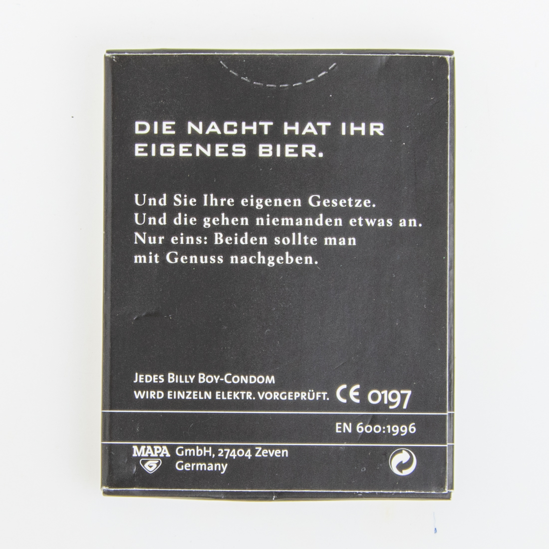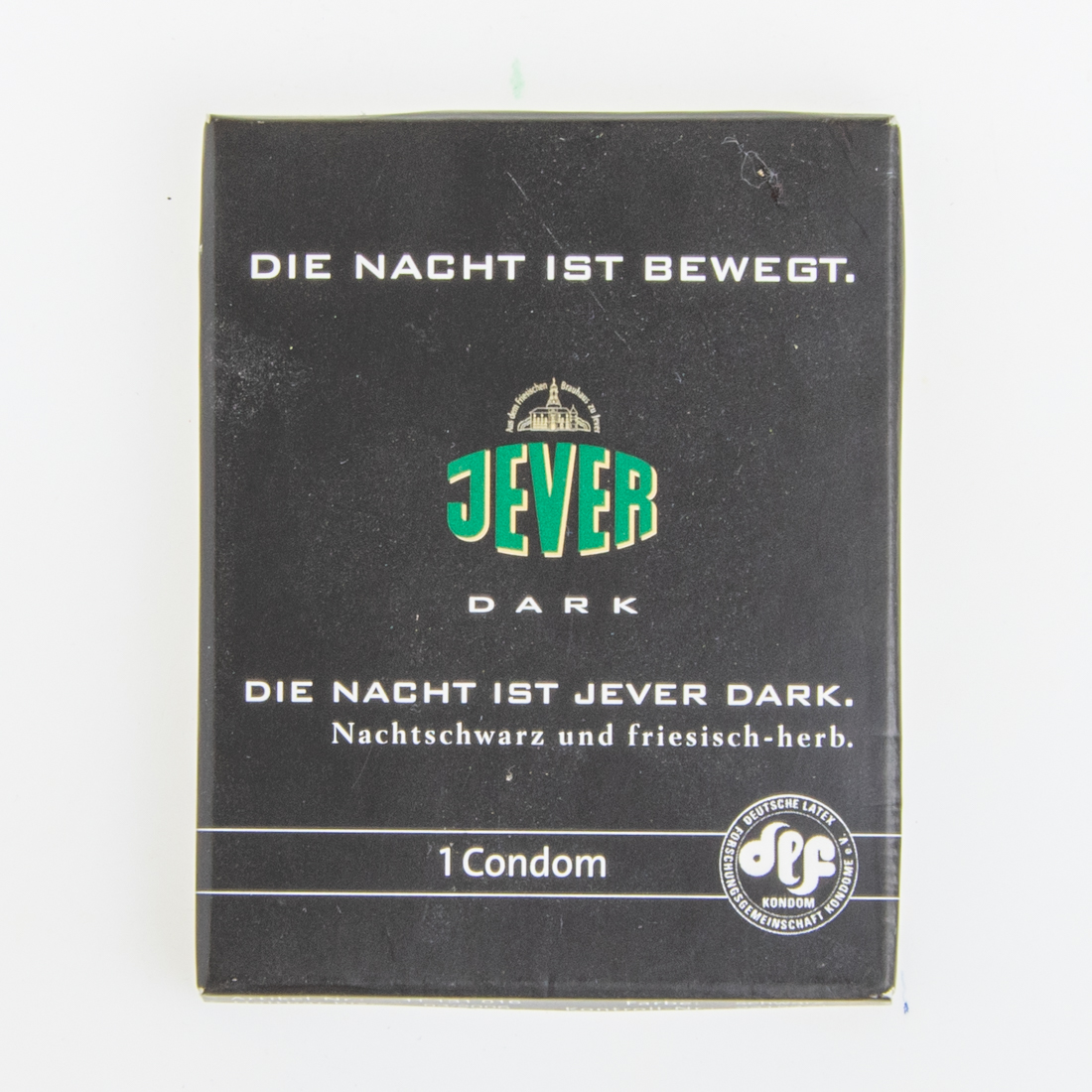 DIE NACHT IST BEWEGT. / Aus dem Friesischen Brauhaus zu Jever / JEVER / DARK / DIE NACHT IST JEVER DARK. / Nachtschwarz und friesisch-herb. / 1 Condom / DEUTSCHE LATEXFORSCHUNGSGEMEINSCHAFT KONDOME e.V. / dlf KONDOM / DIE NACHT HAT IHR EIGENES BIER. / Und Sie Ihre eigenen Gesetze. Und die gehen niemanden etwas an. Nur ein: Beiden sollte man mit Genuß nachgeben. / JEDES BILLY BOY-CONDOM WIRD EINZELN ELEKTR. VORGEPRÜFT. / CE 0197 / EN 600:1996 / MAPA GmbH, 27404 Zeven / Germany / 1 Condom aus Naturkautschuk mit Feuchtfilm. / Glatte, zylindrische Form mit Reservoir, farbig (s. Unterseite), mit Aroma. / Kühl, trocken und vor Hitze und direkter Sonneneinstrahlung geschützt lagern.
