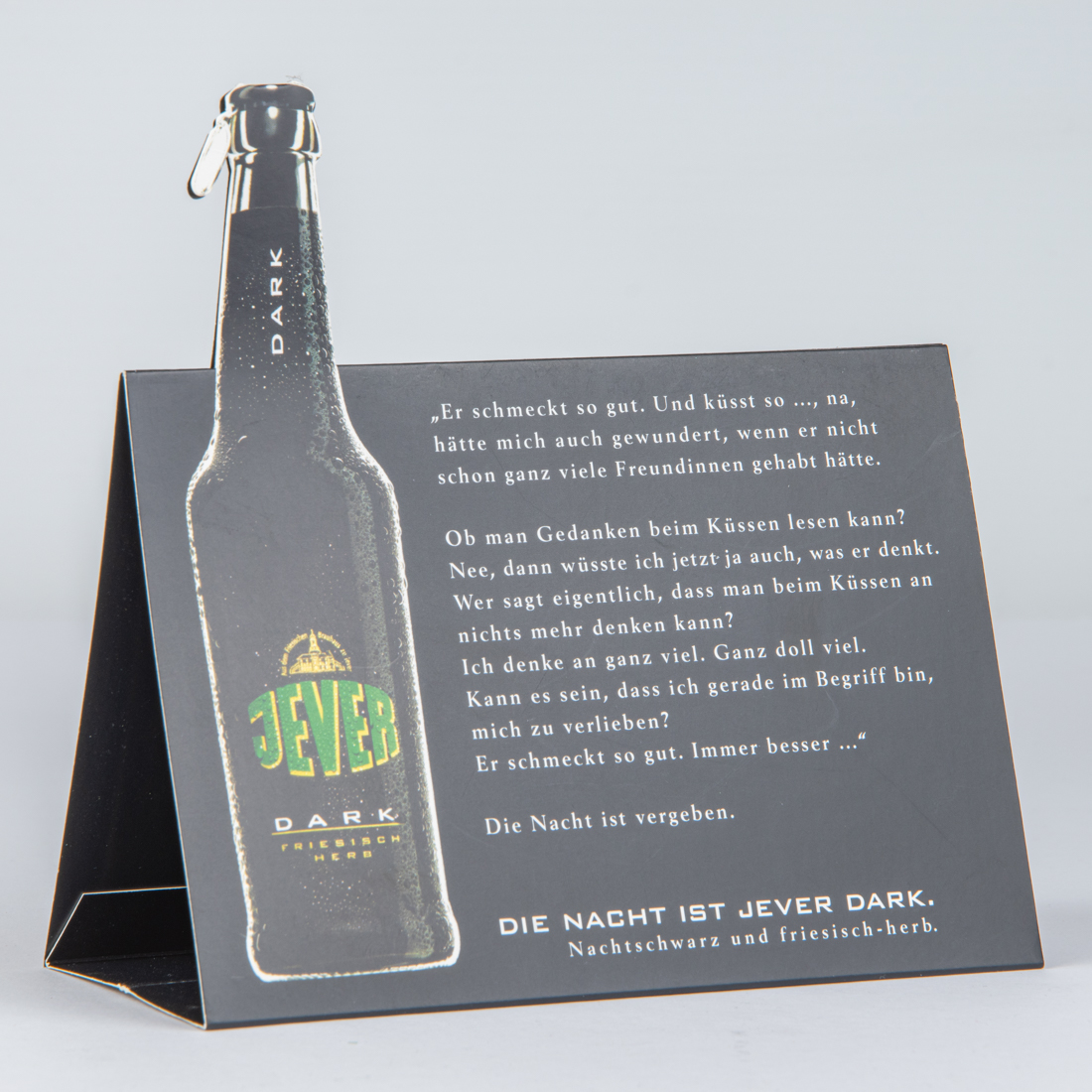 DARK / Aus dem Friesischen Brauhaus zu Jever / JEVER / DARK / FRIESISCH HERB / “Er schmeckt so gut. UNd küsst so …, na, hätte mich auch gewundert, wenn er nicht schon ganz viele Freundinnen gehabt hätte. / Ob man Gedanken beim Küssen lesen kann? Nee, dann wüsste ich jetzt ja auch, was er denkt. Wer sagt eigentlich, dass man beim Küssen an nichts mehr denken kann? Ich denke an ganz viel. Ganz doll viel. Kann es sein, dass ich gerade im Begriff bin, mich zu verlieben? Er schmeckt so gut. Immer besser …” / Die Nacht ist vergeben. / DIE NACHT IST JEVER DARK. / Nachtschwarz und friesisch-herb.