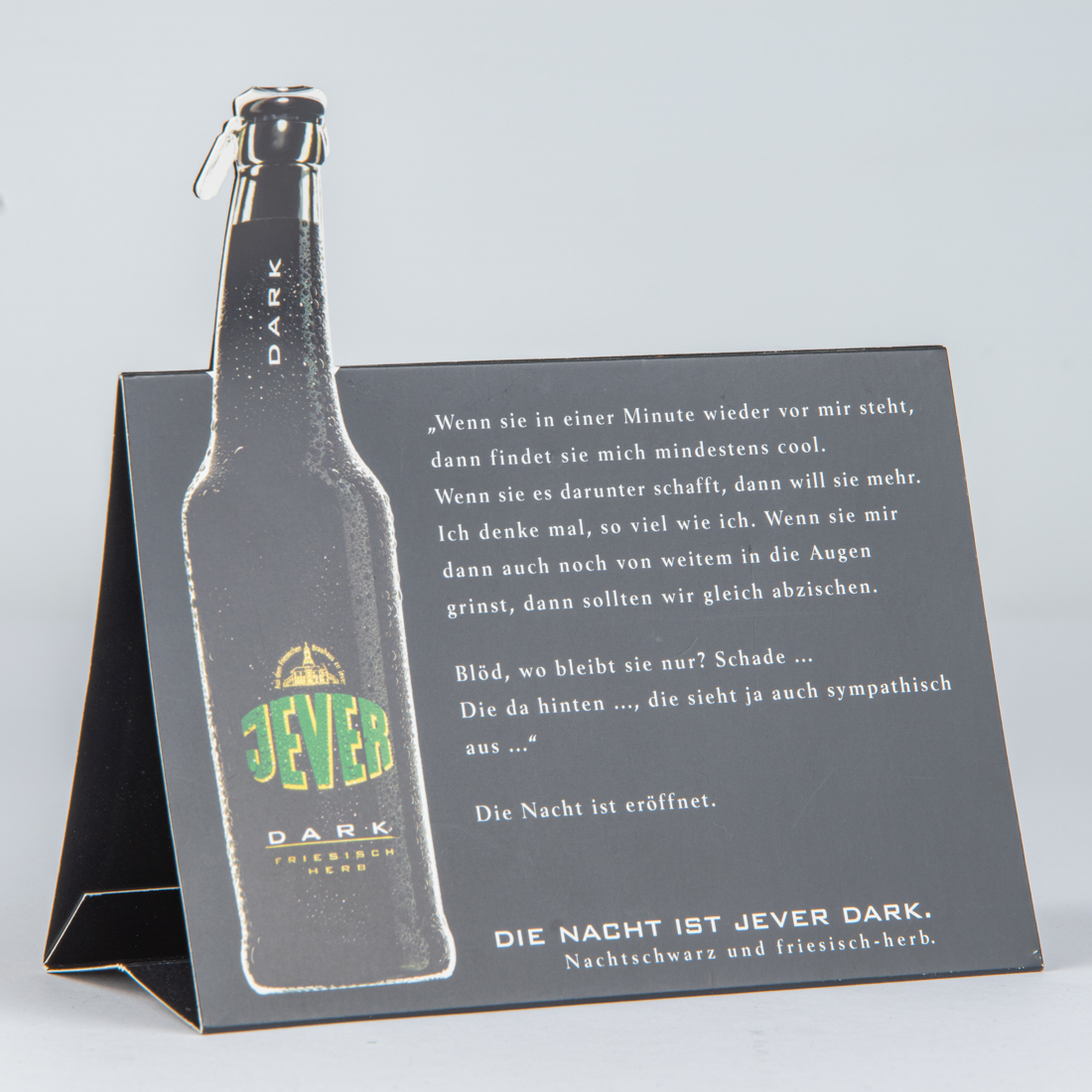 DARK / Aus dem Friesischen Brauhaus zu Jever / JEVER / DARK / FRIESISCH HERB / “Wenn sie in einer Minute vor mir steht, dann findet sie mich mindestens cool. Wenn sie es darunter schafft, will sie mehr. Ich denke mal, so viel wie ich. Wenn sie mir dann auch noch von weitem in die Augen grinst, dann sollten wir gleich abzischen. Blöd, wo bleibt sie nur? Schade … Die da hinten …, die sieht ja auch sympathisch aus …” / Die Nacht ist eröffnet. / DIE NACHT IST JEVER DARK. / Nachtschwarz und friesisch-herb.