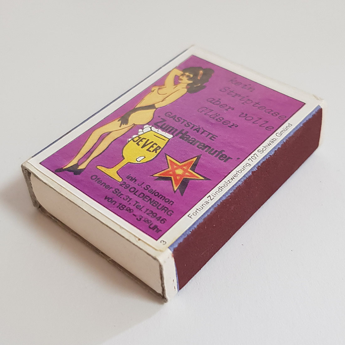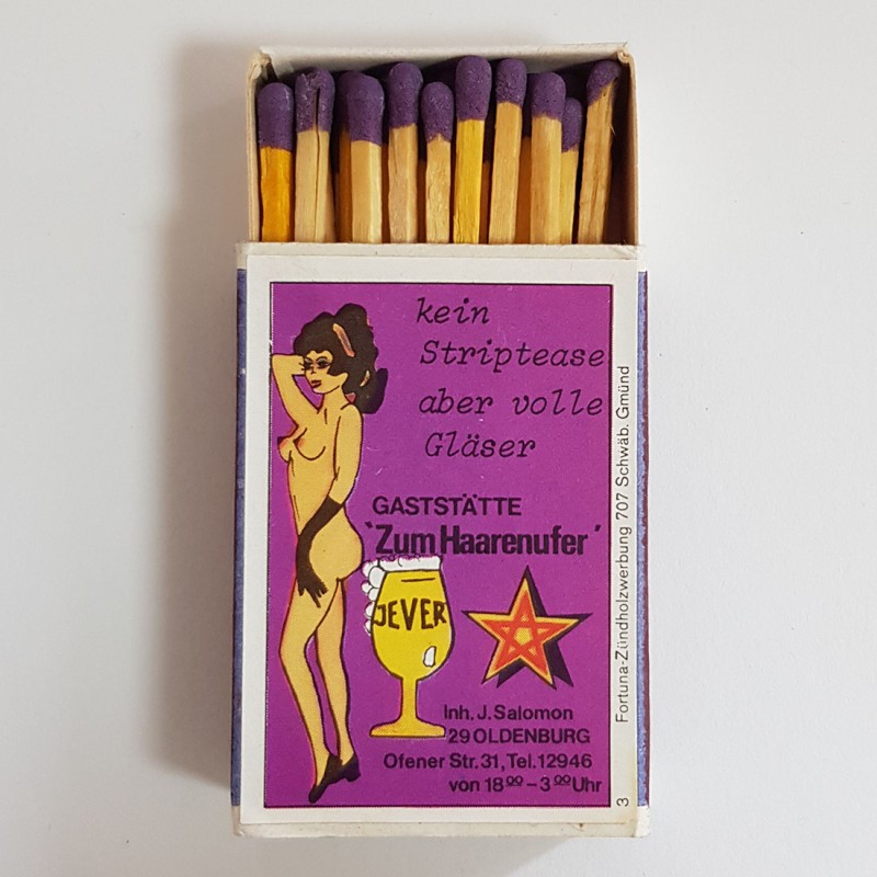 Attribut Wert Alter (min.) Alter (max.) Identifikation (Jever-Fan) ID I004222 / S1760 / B53 Typ Streichhölzer Attribute (Allgemein) Form Quader Gastronomie Zum Haarenufer Logo Dachmarke 1 Maße HxBxT (cm) 5,3x3,6x1,3 Material Papier/Pappe Ort Oldenburg (Oldb) > Oldenburg (Oldb) > Oldenburg (Oldb) > Niedersachsen > Deutschland Sorte (Dachmarke)
