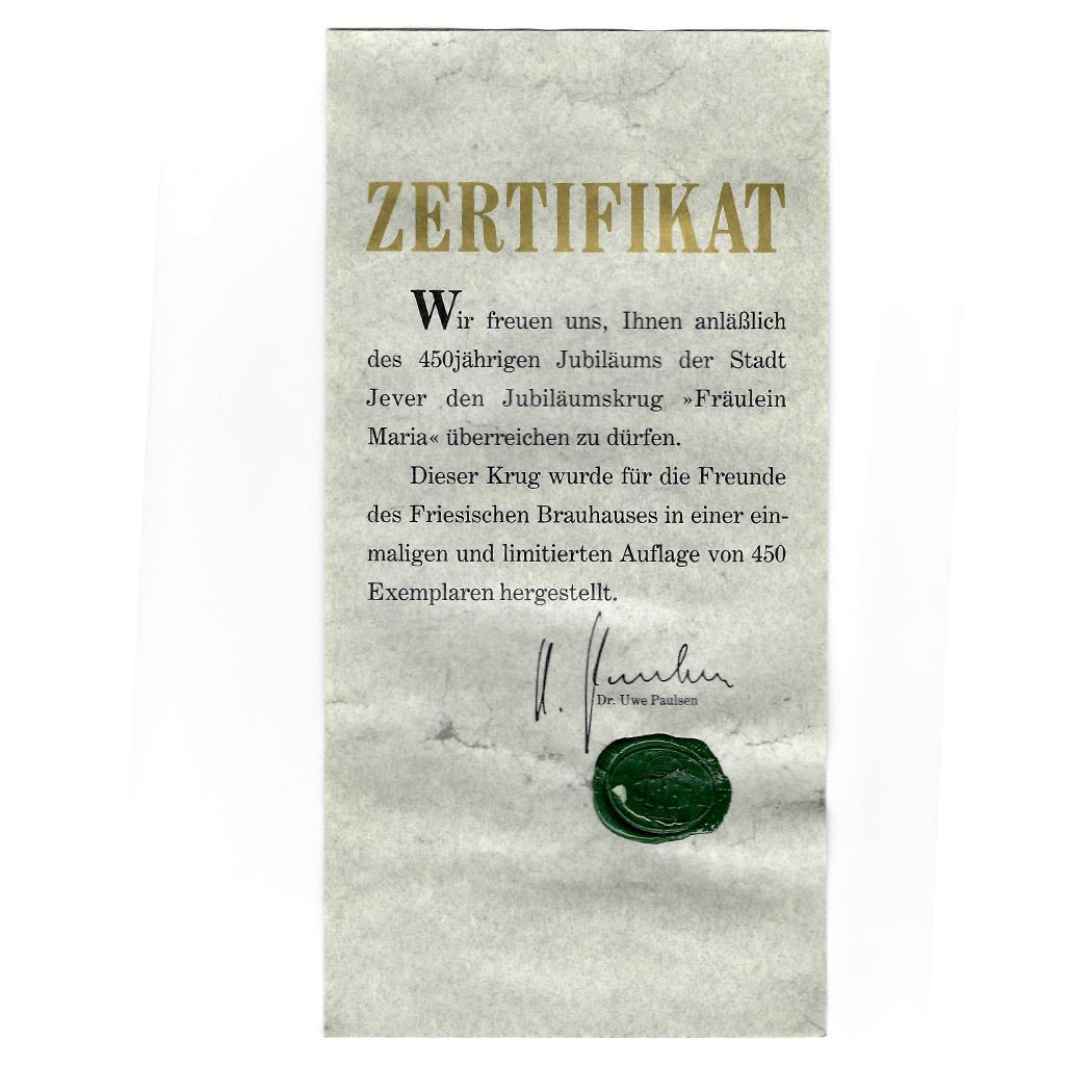 ZERTIFIKAT / Wir freuen uns, Ihnen anläßlich des 450jährigen Jubiläums der Stadt Jever den Jubiläumskrug “Fräulein Maria” überreichen zu dürfen. Dieser Krug wurde für die Freunde des Friesischen Brauhauses in einer einmaligen und limitierten Auflage von 450 Exemplaren hergestellt. / Dr. Uwe Paulsen