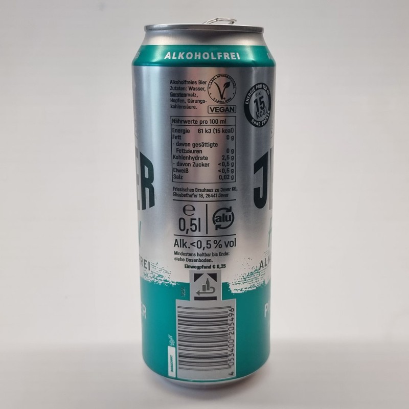 ALKOHOLFREI / Alkoholfreies Bier / Zutaten: Wasser, Gerstenmalz, Hopfen, Gährungskohlensäure. / V-LABEL INTERNATIONAL V-LABEL.COM / Nährwerte pro 100 ml Energie 61 kJ (15 kcal) Fett 0 g - davon gesättigte Fettsäuren 0 g Kohlenhydrate 2,5 g - davon Zucker <0,5 g Eiweiß < 0,5 g Salz 0,02 g / Friesisches Brauhaus zu Jever KG, Elisabethufer 18, 26441 Jever / e 0,5l / alu / Alk. <0,5 % vol / Mindestens haltbar bis Ende: siehe Dosenboden. / Einwegpfand € 0,25 / 15237 / 4 053400 205496