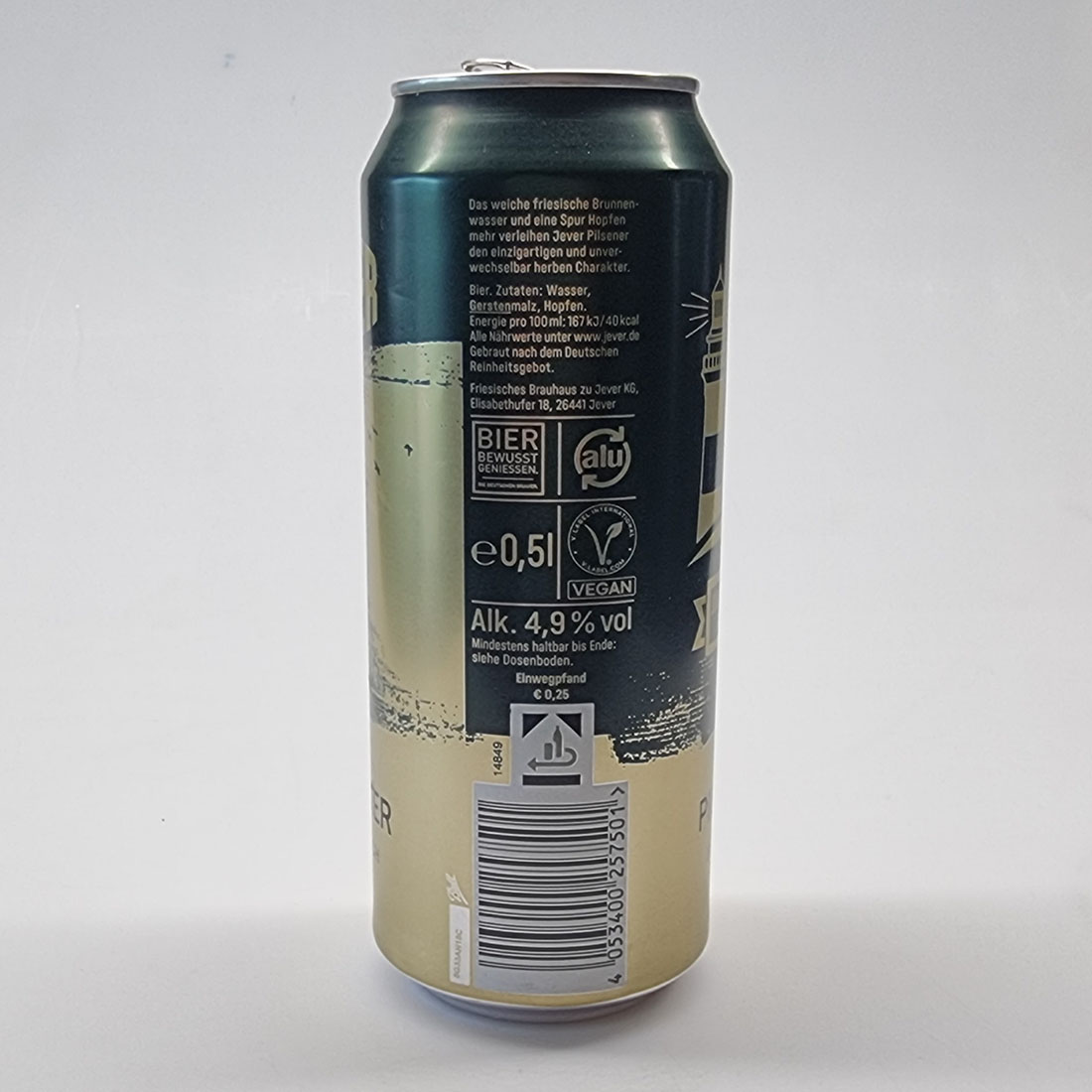 Das weiche friesische Brunnenwasser und eine Spur Hopfen mehr verleihen Jever Pilsener den einzigartigen und unverwechselbar herben Charakter. / Bier. Zutaten: Wasser, Gerstenmalz, Hopfen. / Energie pro 100ml: 167 kJ / 40 kcal / Alle Nährwerte unter www.jever.de / Gebraut nach dem Deutschen Reinheitsgebot. / Friesisches Brauhaus zu Jever KG, Elisabethufer 18, 26441 Jever / BIER BEWUSST GENIESSEN. DIE DEUTSCHEN BRAUER. / alu / e 0,5l / V-LABEL-INTERNATIONAL V-LABEL.COM / Alk. 4,9 % vol / Mindestens haltbar bis Ende: siehe Dosenboden. / Einwegpfand € 0,25 / 14849 / 4 053400 257501